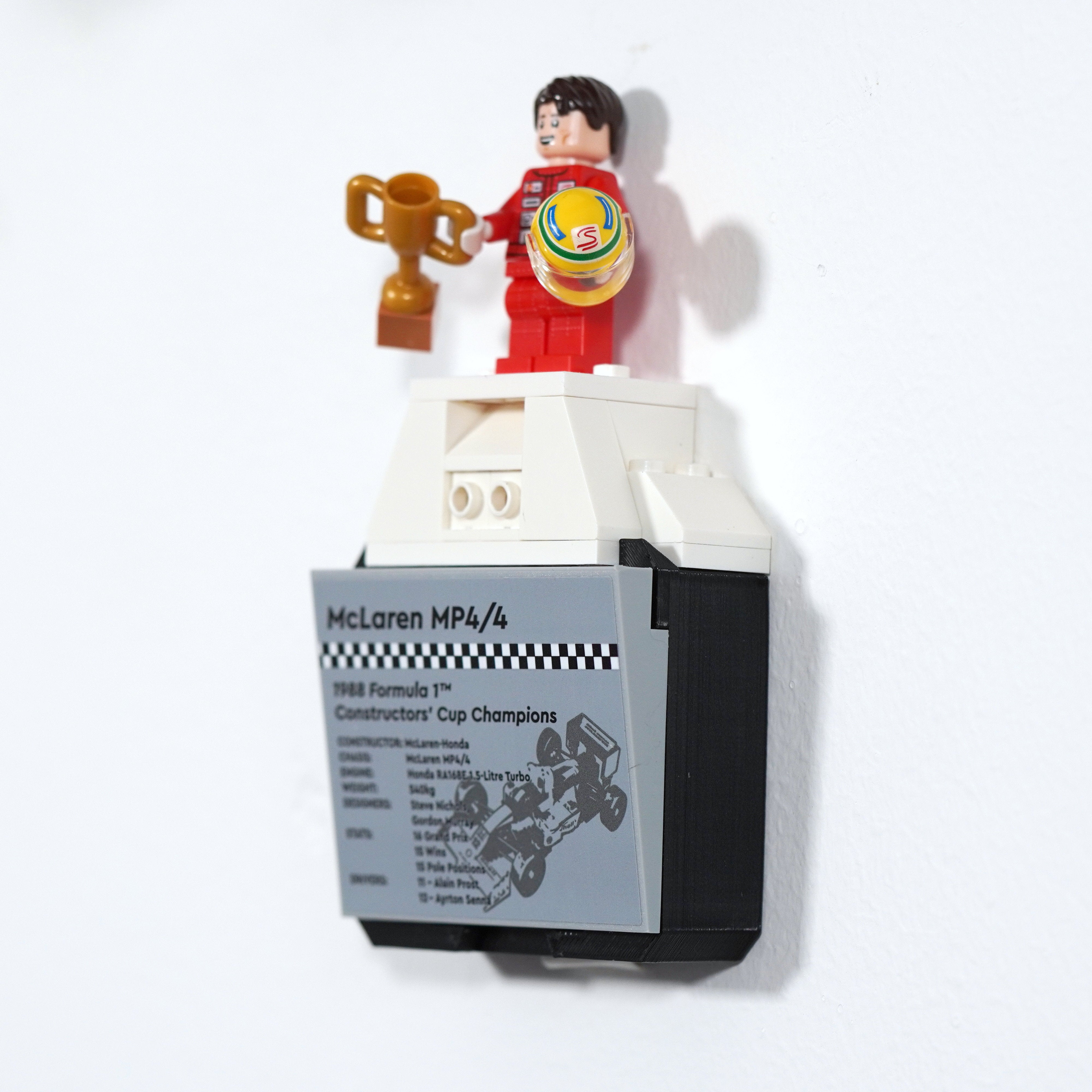 Dette vægbeslag giver en elegant løsning til ophængning af din McLaren MP4/4 model. Designet gør det muligt at montere bilen vendt mod enten venstre eller højre. Der medfølger desuden en separat displayblok til Senna-minifiguren og informationspladen, så hele sættet kan præsenteres samlet på væggen.