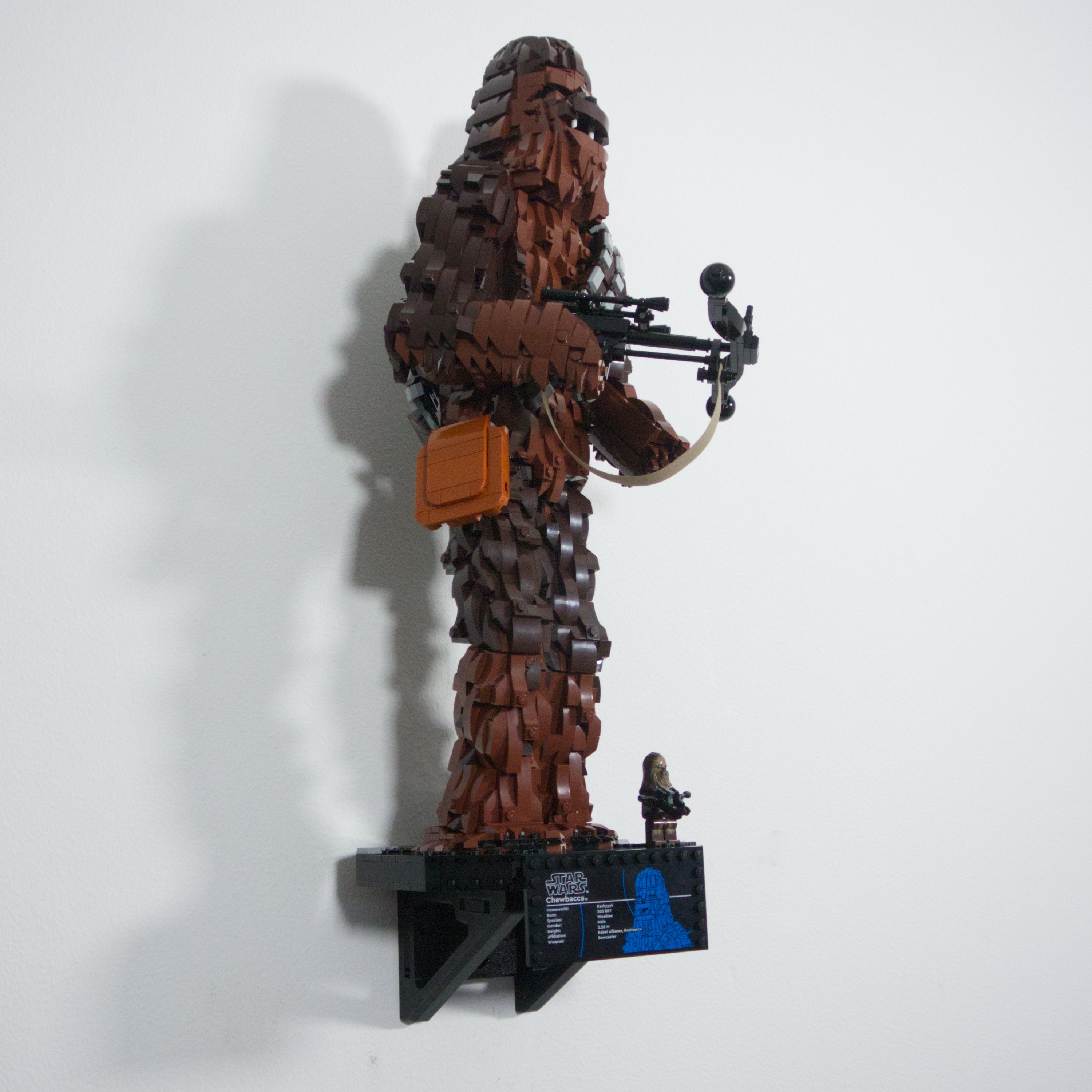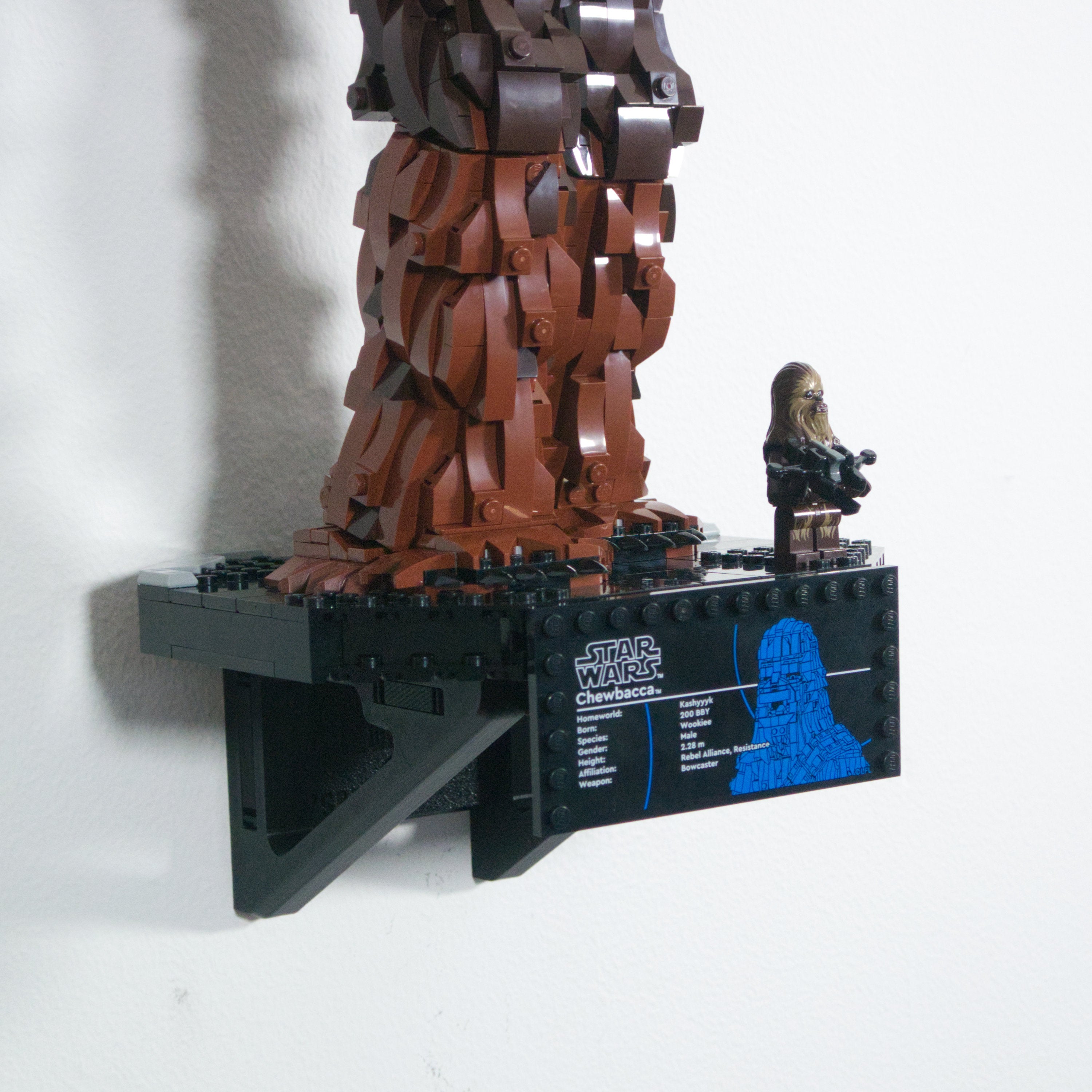 Vis din LEGO Star Wars Chewbacca frem med dette funktionelle vægophæng. Beslaget monteres sikkert med to skruer og gør det let at fjerne modellen ved behov. Der medfølger desuden en dedikeret holder til både informationspladen og minifiguren for en komplet udstilling.