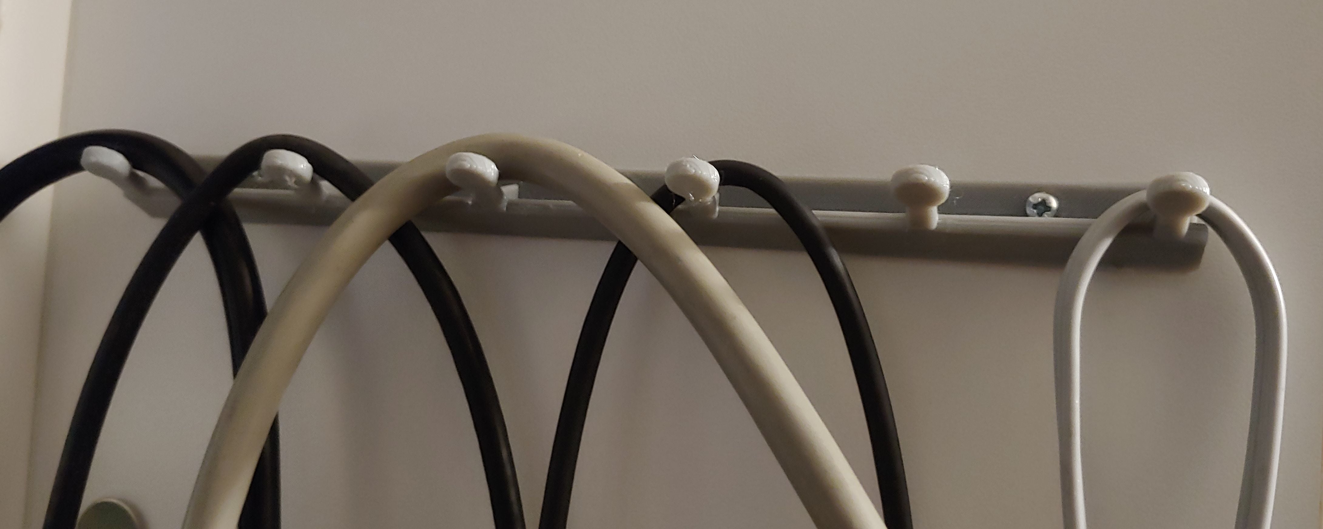 Tento držák kabelů slouží ke snadnému přehledu o volných kabelech. Je vytištěn z PLA filamentu o tloušťce vrstvy 3,5 mm. Držák kabelů vám pomůže udržet si přehled o kabelech a udělá pořádek na pracovišti.