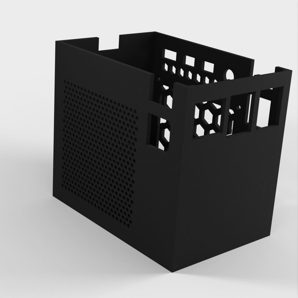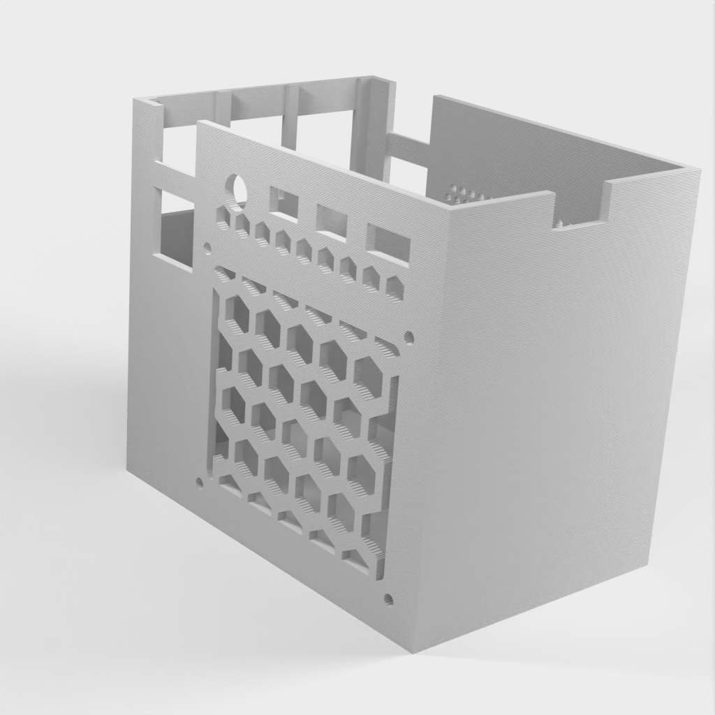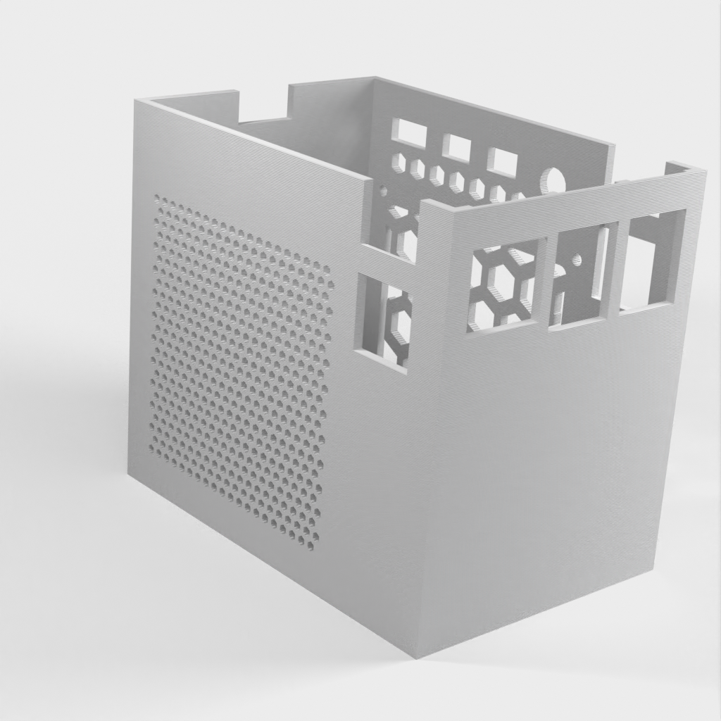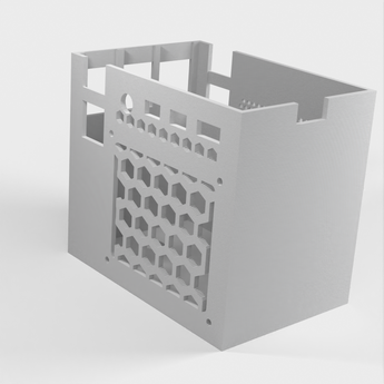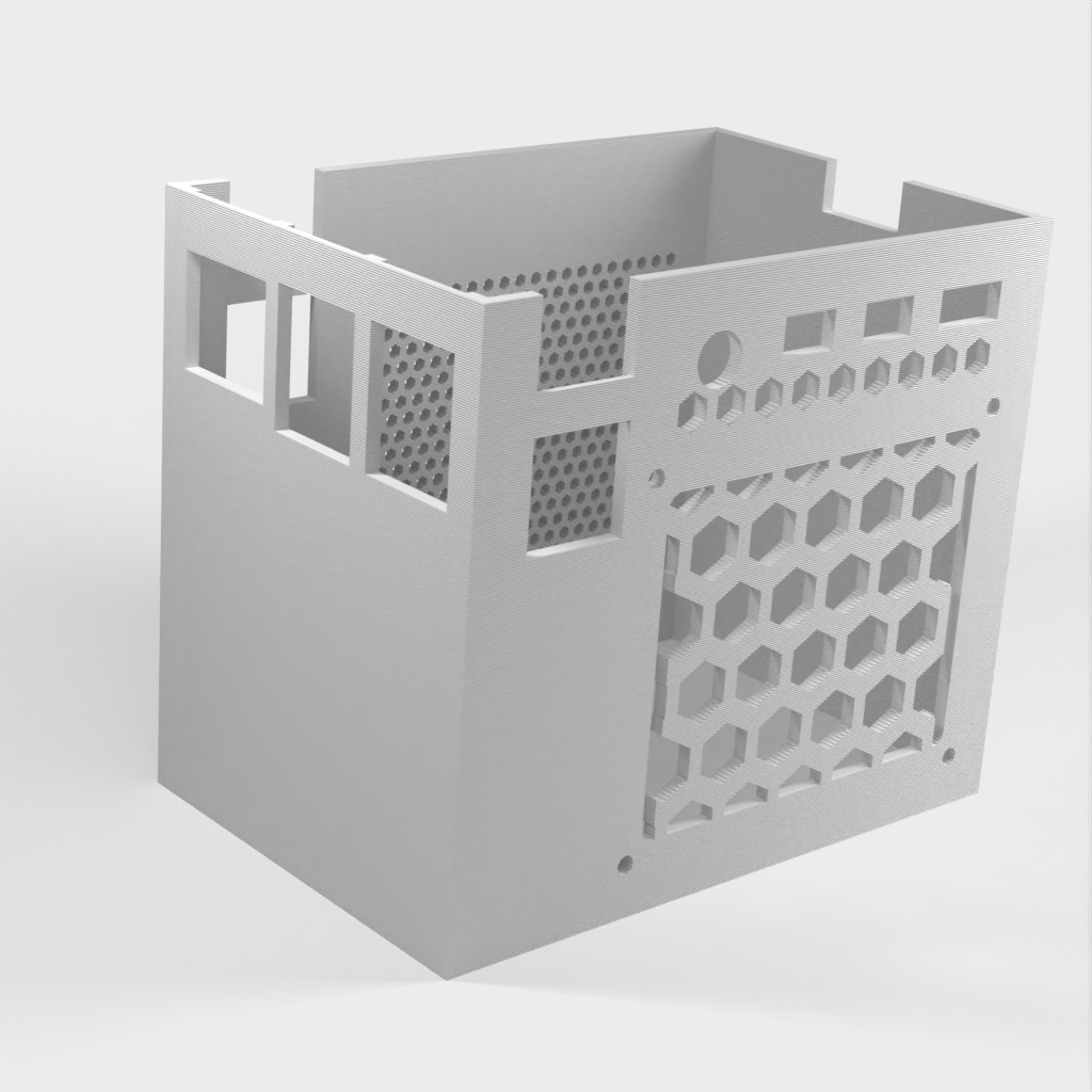 Toto je minimalistické pouzdro pro Raspberry Pi 4, do kterého se vejde chladič Ice Tower. Horní konstrukce pouzdra má na zadní straně větší šestiúhelníky, což usnadňuje tisk. Po vytištění lze tyto šestiúhelníky odstranit a dodat pouzdru hezčí vzhled pomocí akrylové desky, která se dodává s chladičem Ice Tower namontovaným na boku pouzdra. Klipy a spodní část kufříku jsou upraveny tak, aby k sobě lépe přiléhaly a podporovaly více průměrů gumových nožiček.