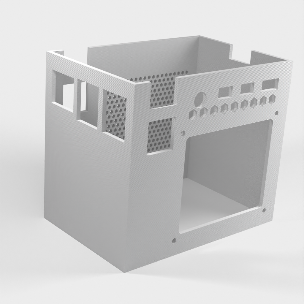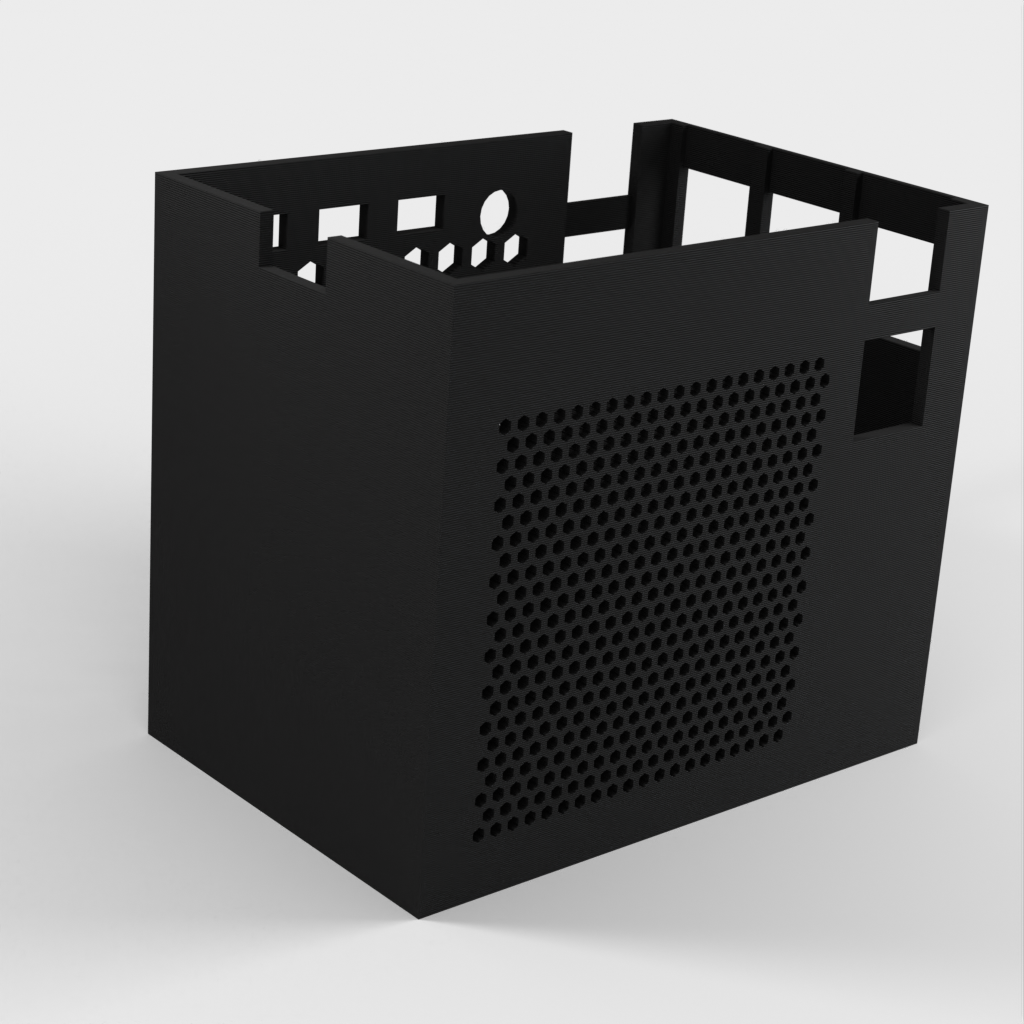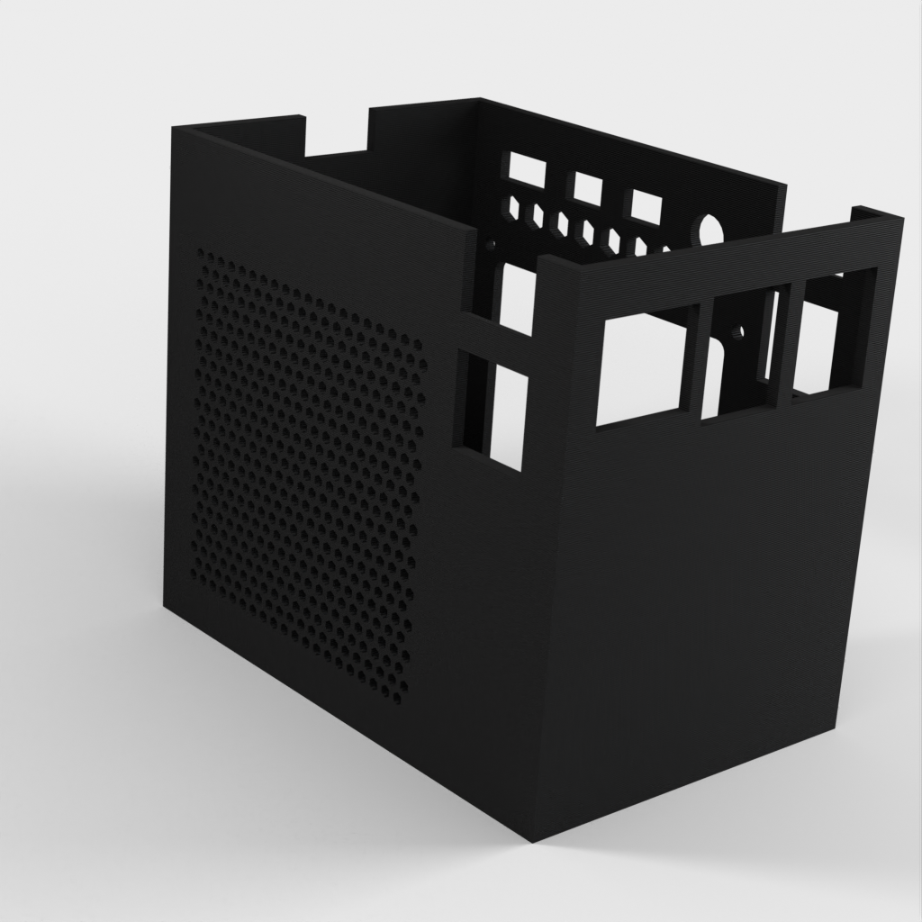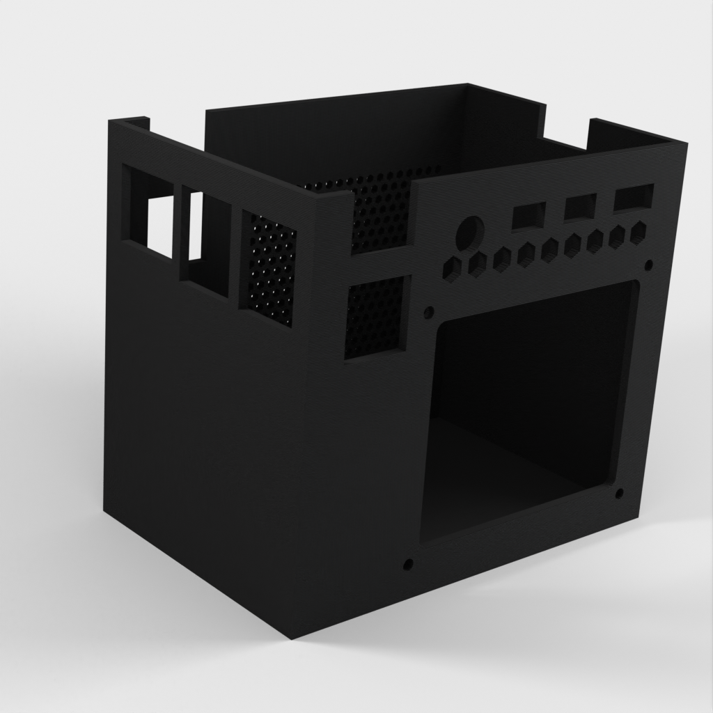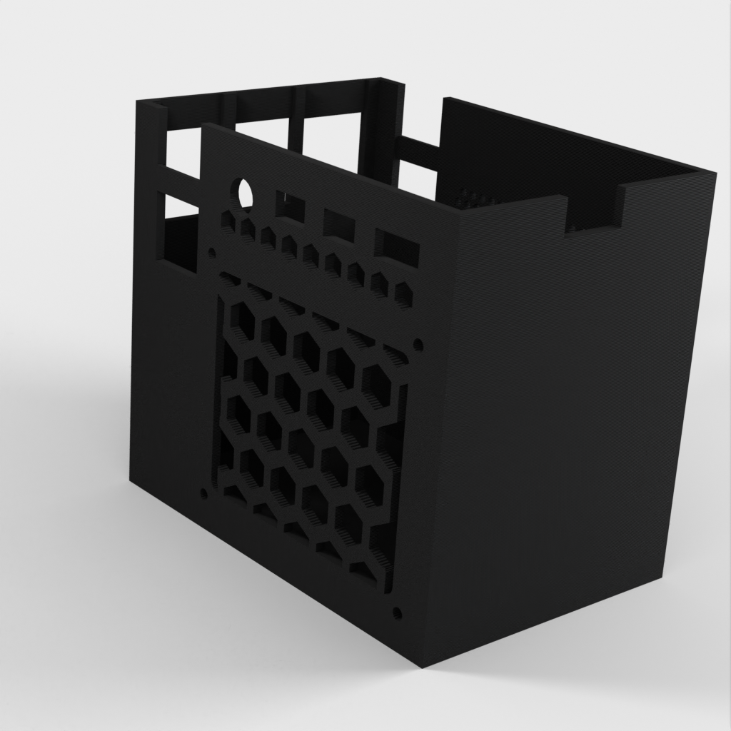 Toto je minimalistické pouzdro pro Raspberry Pi 4, do kterého se vejde chladič Ice Tower. Horní konstrukce pouzdra má na zadní straně větší šestiúhelníky, což usnadňuje tisk. Po vytištění lze tyto šestiúhelníky odstranit a dodat pouzdru hezčí vzhled pomocí akrylové desky, která se dodává s chladičem Ice Tower namontovaným na boku pouzdra. Klipy a spodní část kufříku jsou upraveny tak, aby k sobě lépe přiléhaly a podporovaly více průměrů gumových nožiček.