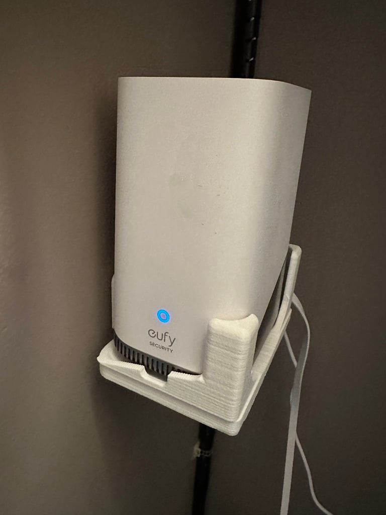 Montáž na stěnu pro bezpečnostní systém Eufy HomeBase 3. Montážní příslušenství je navrženo s ohledem na ventilaci a pevnost stěny. Má větrací otvory vespod a otvory v rozích pro proudění vzduchu. Stěny jsou silnější pro větší tuhost. Ideální pro umístění blízko vašeho síťového přepínače, protože je pevně připojen k ethernetu. Všimněte si, že produkt zobrazený v příkladech je tištěný 3D.