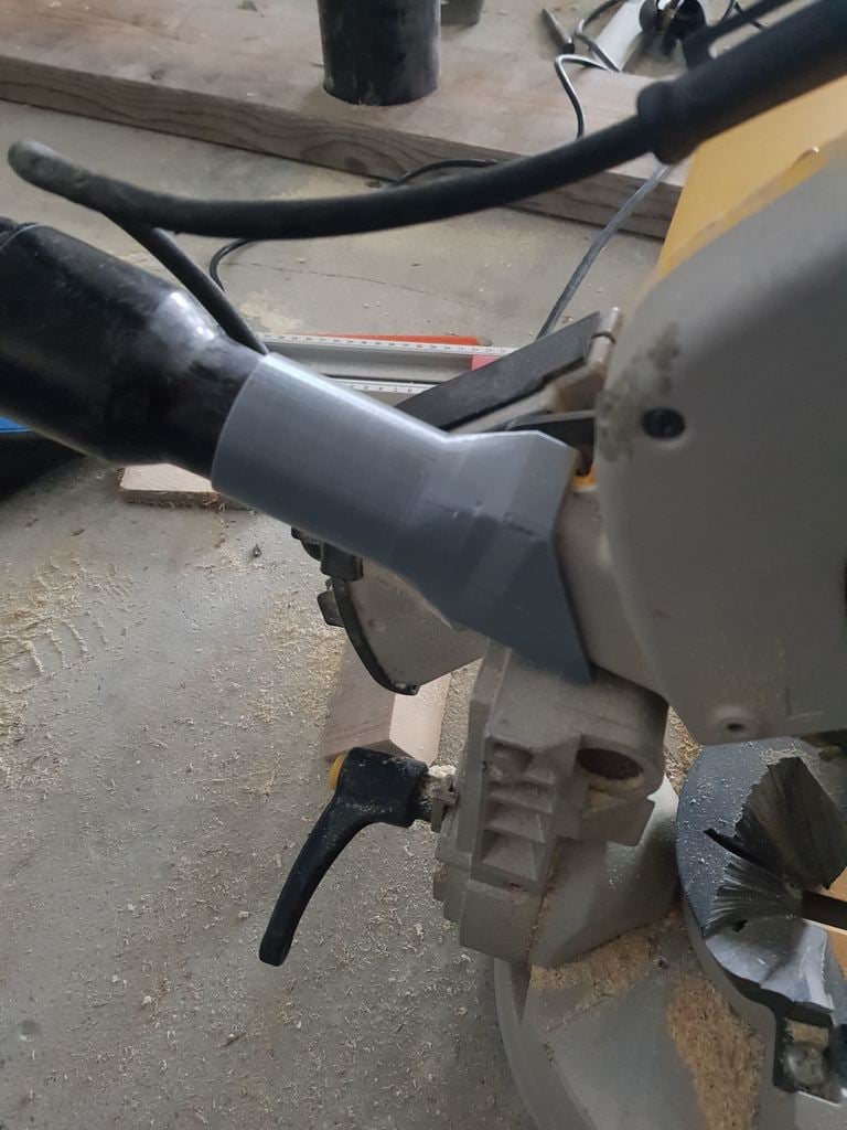 Toto je 3D tištěný adaptér pro připojení hadice vysavače k pokosové pile Dewalt 707. Připojení k hadici vysavače je založeno na kuželové trubce o průměru 34 až 36 mm v délce 50 mm.