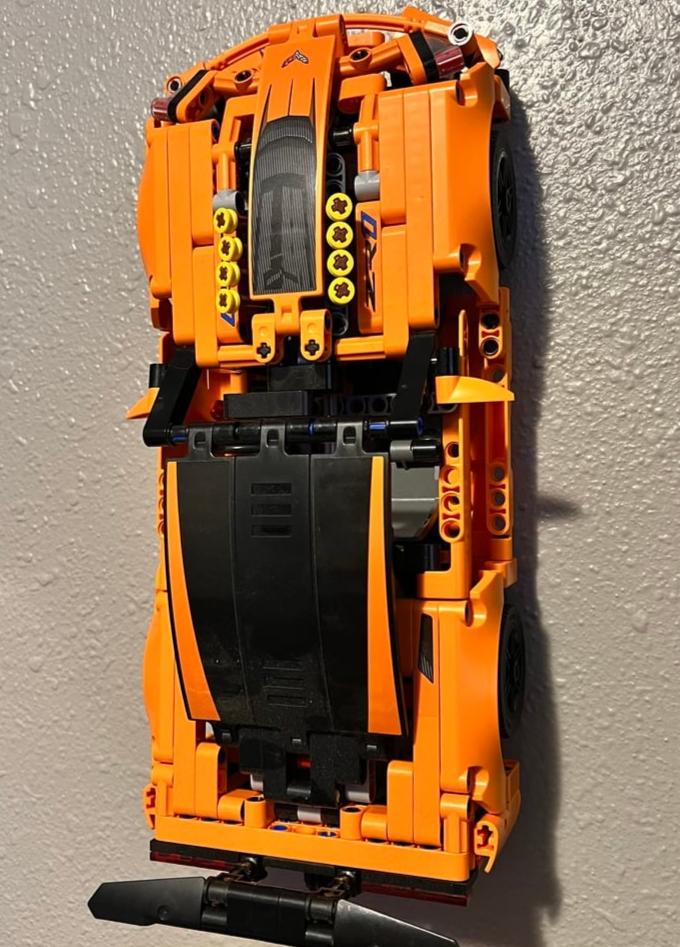 Jednoduchý nástěnný držák pro stavebnici Lego Technic Orange Corvette (#42093). Tento nástěnný držák umožňuje snadno vystavit model Lego úhledným a reprezentativním způsobem a zároveň udržuje stavebnice uspořádané a chráněné.