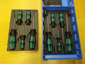 Tento stohovatelný podnos je navržen pro efektivní uspořádání vašich šroubováků. Je speciálně upraven pro uložení tří hlavních velikostí rukojetí a délek čepelí WERA. Každý podnos pojme 2 velké (čepel 100 mm, rukojeť 98 mm), 2 střední (čepel 80 mm, rukojeť 81 mm) a 1 malý šroubovák (čepel 60 mm, rukojeť 70 mm).