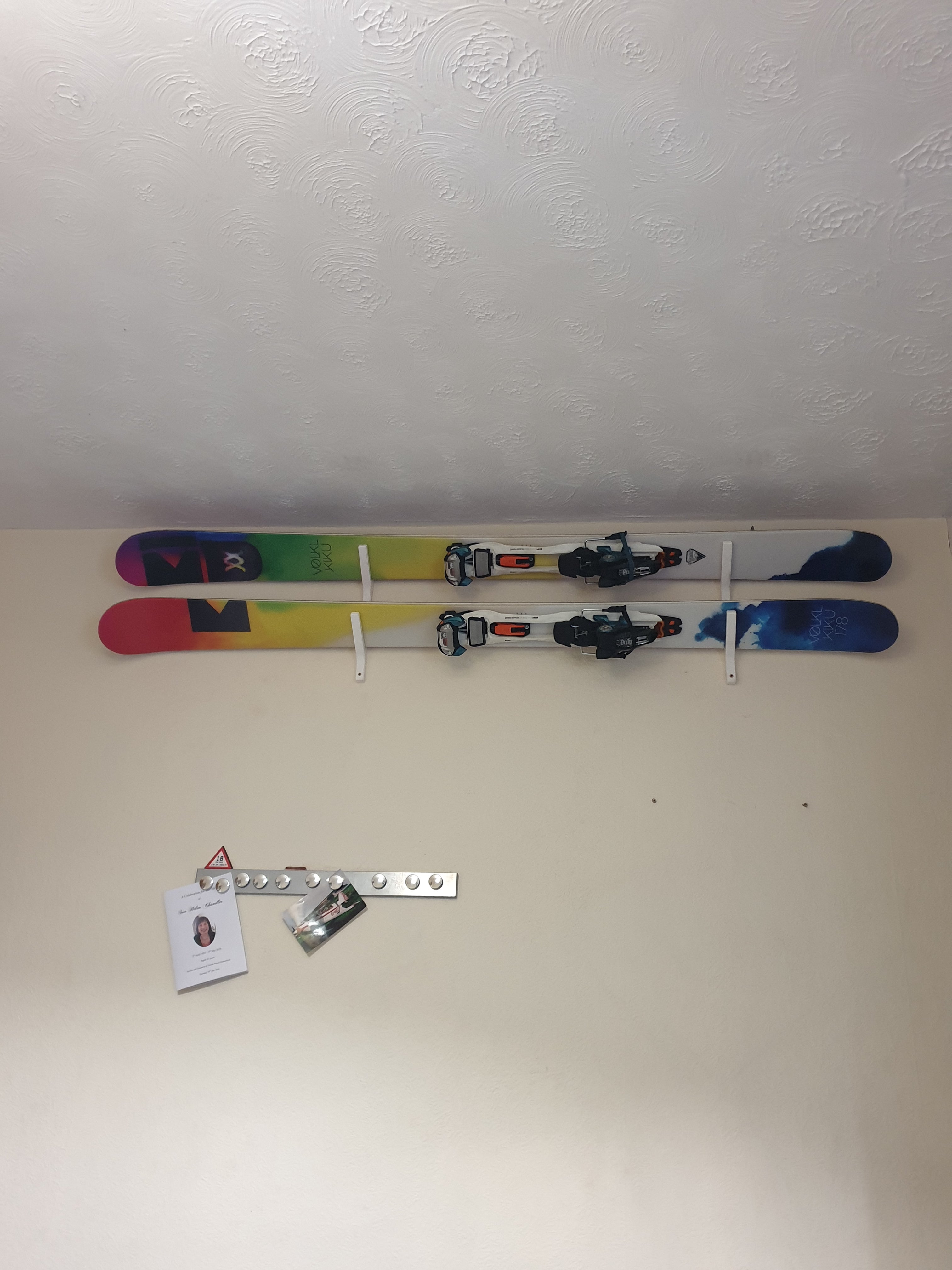 Toto je nakloněný držák lyží na stěnu, který je navržen pro snadné skladování a elegantní vystavení vašich lyží. Držák umožňuje zobrazení horní vrstvy lyže a v případě potřeby ji lze snadno odstranit. K připevnění na cihlovou zeď vyžaduje dva šrouby a dvě hmoždinky nebo pouze vruty do dřeva, pokud je namontován na sádrokartonovou stěnu. Každý držák pojme pár lyží, takže k zavěšení páru lyží budete potřebovat celkem 2 držáky.