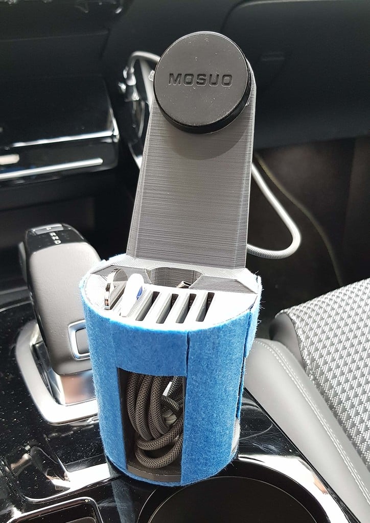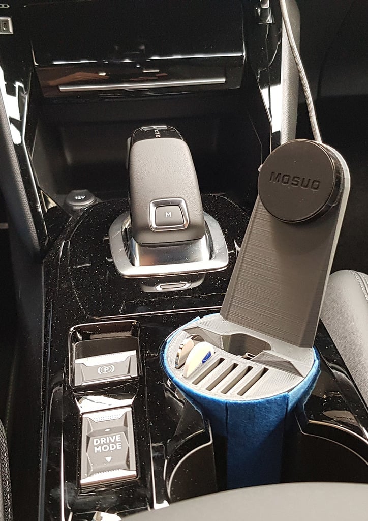 Kromě úložného prostoru pro telefon obsahuje design šest přihrádek na mince, které lze použít k praktickému uložení drobných mincí, např. pro parkování nebo mýtné. Produkt je navržen tak, aby přesně pasoval do stávajícího držáku nápojů v autě, a pro ještě optimálnější uchycení lze případně přidat plstěnou vrstvu.
