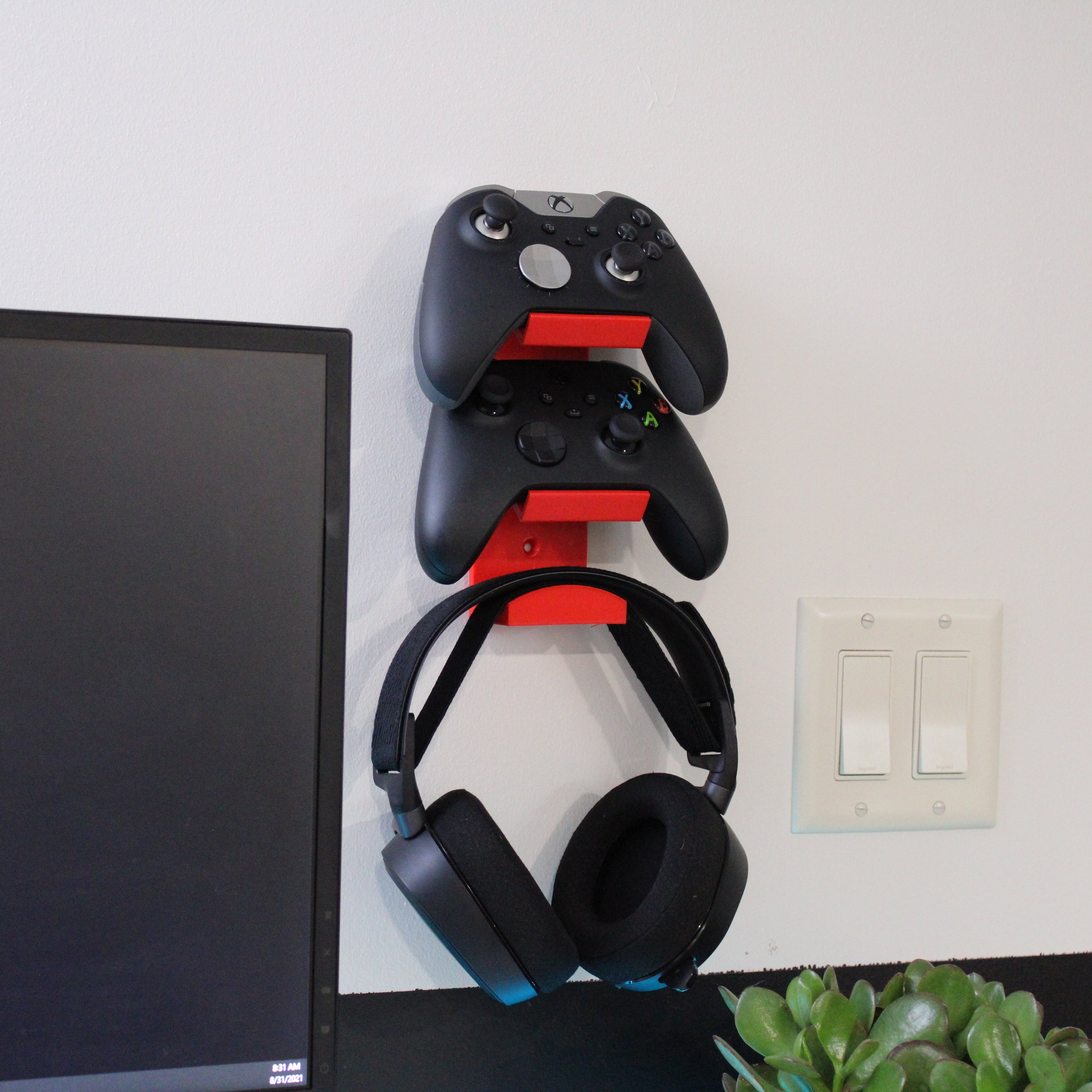Praktický nástěnný držák pro dva ovladače a náhlavní soupravu