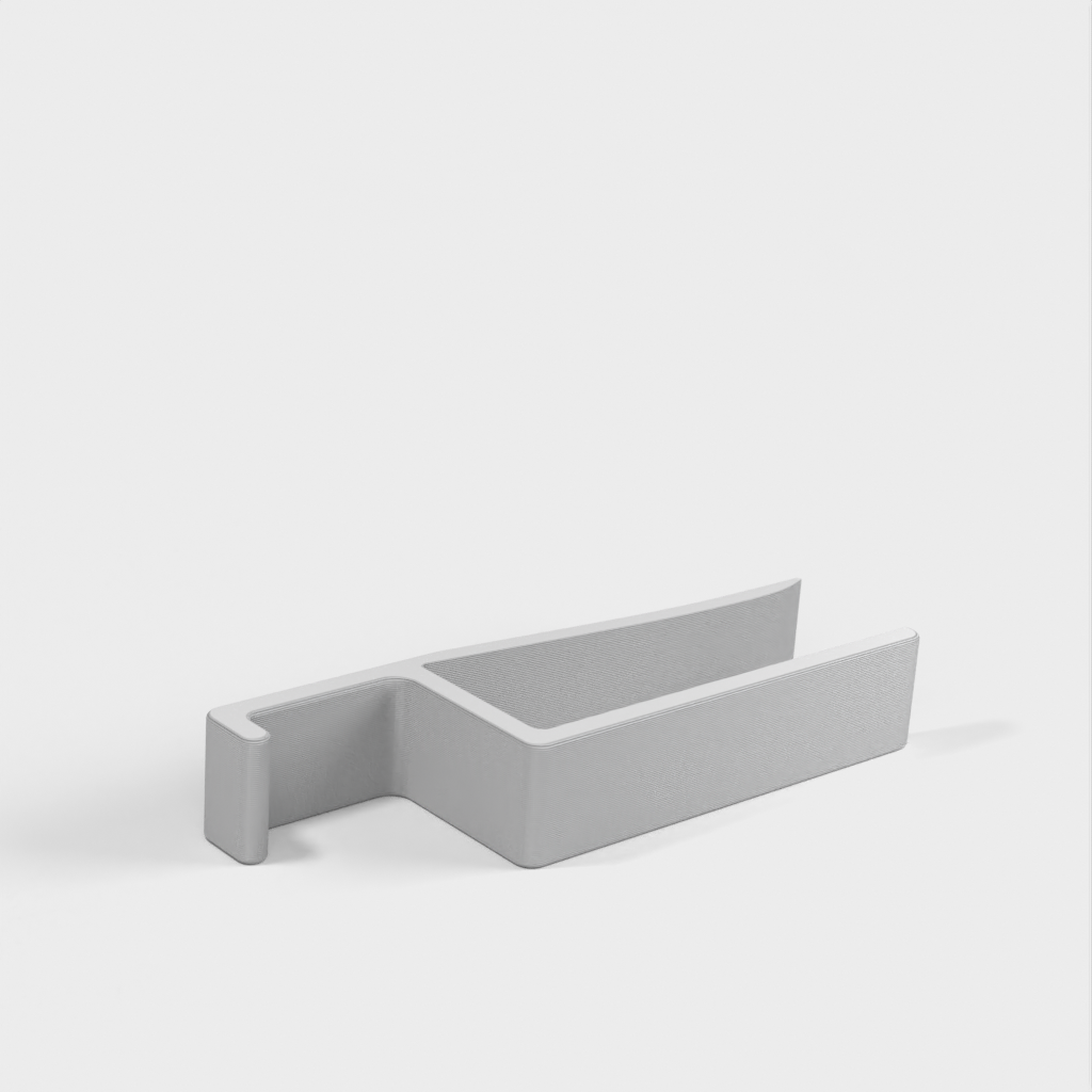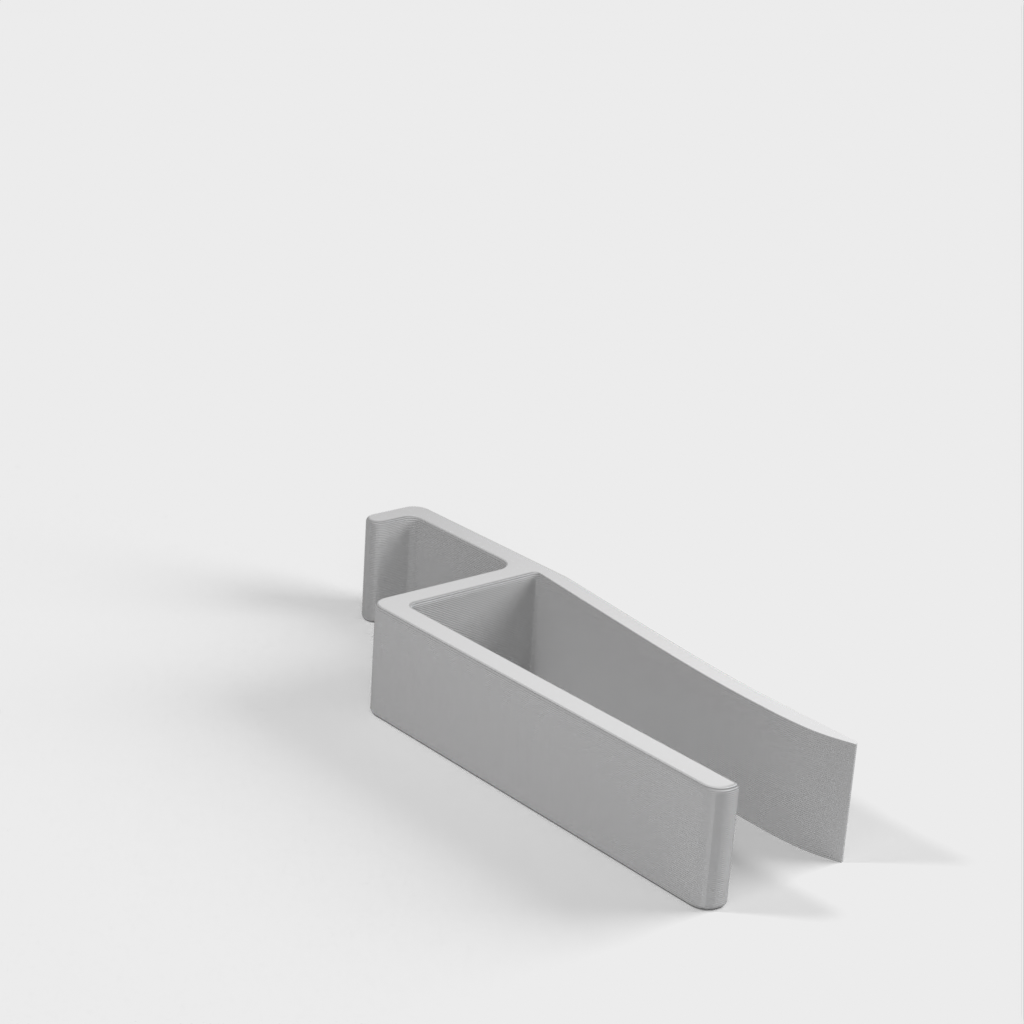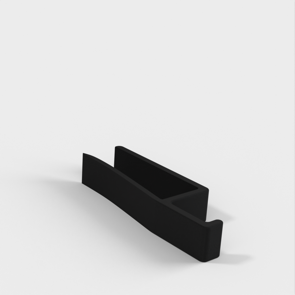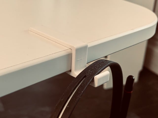Jednoduchý háček na psací stoly IKEA Bekant. Snadno se posouvá na horní část stolu.