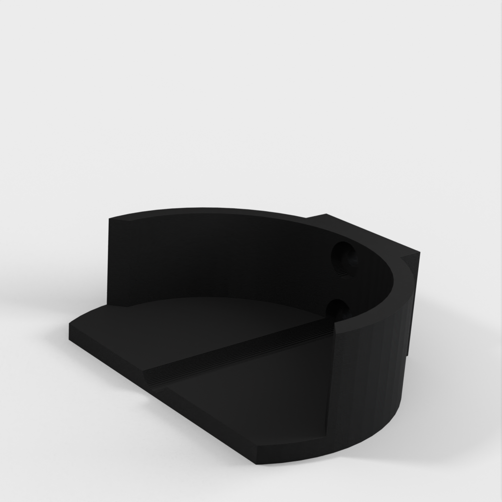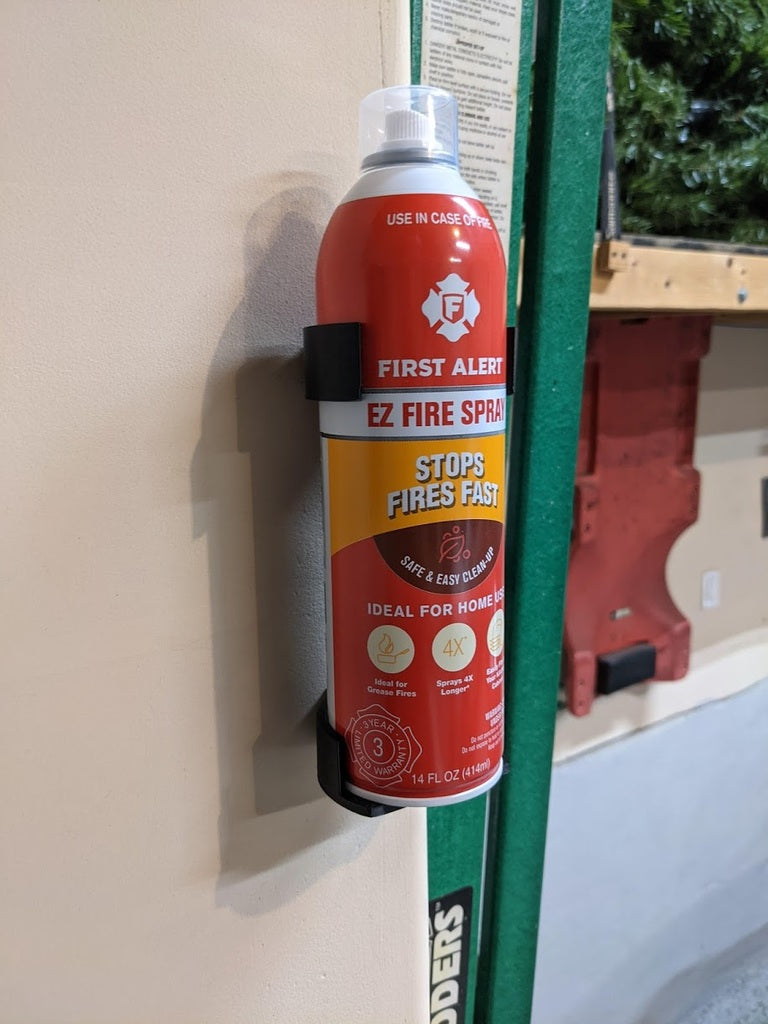 Jedná se o jednoduchý nástěnný držák pro hasicí přístroj se sprejem First Alert Tundra. Není to nic převratného, ale funguje to. Horní držák dělá většinu práce při držení plechovky na místě, zatímco spodní držák funguje spíše jako držák.