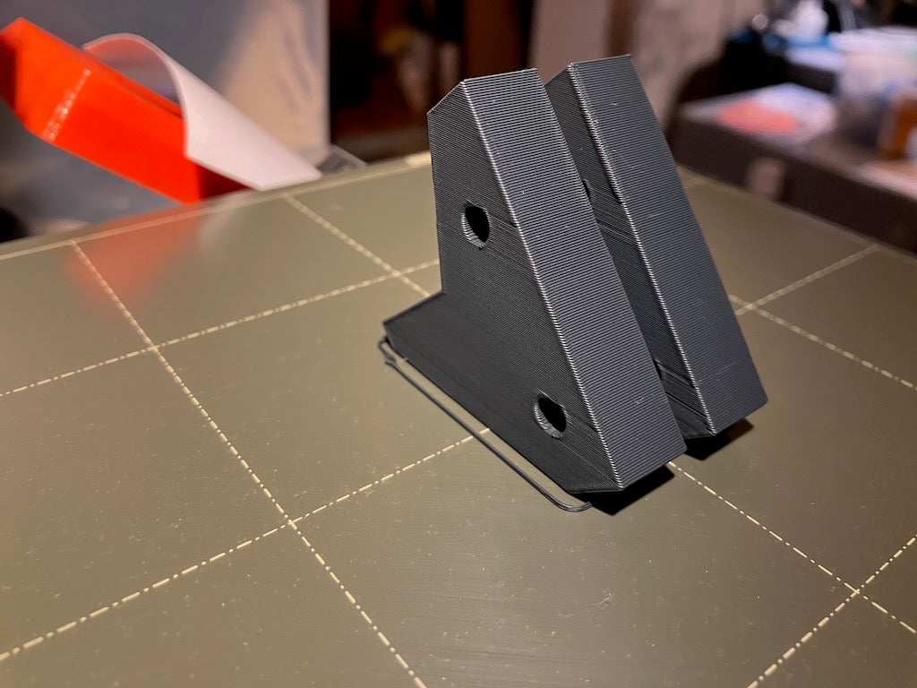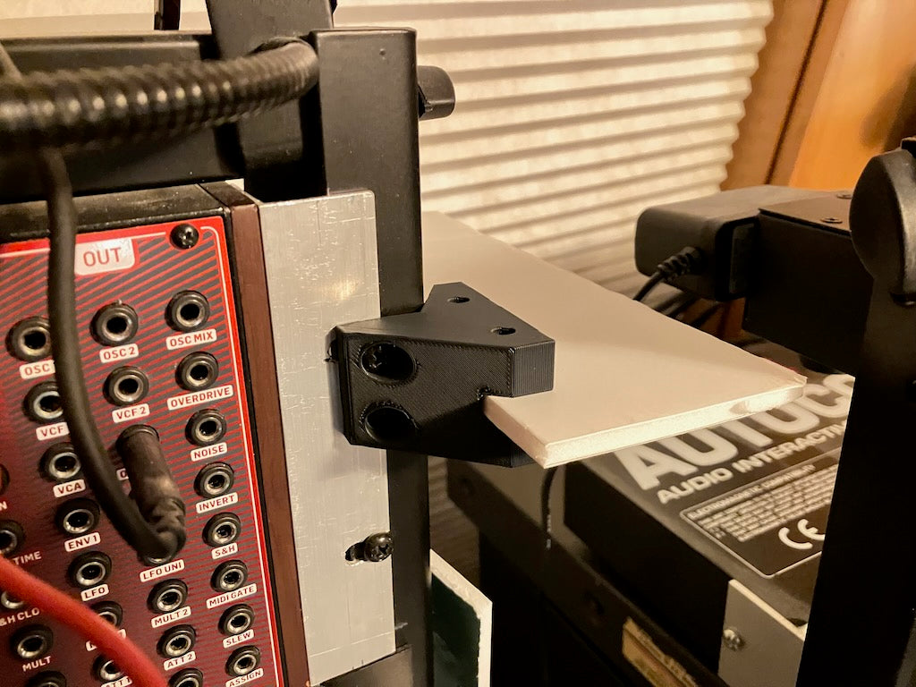 K upevnění police z plochého materiálu můžete použít lepidlo, šrouby nebo jednoduše vyvrtat do materiálu otvory podle vzoru na držáku a vložit přibližně 5mm kolíky jako kolíky. Šířka materiálu vaší police by měla být přibližně 428 mm pro 19' regál, ale regály jsou notoricky známé svou proměnlivostí, takže po instalaci držáků změřte šířku nebo delší a podle potřeby zkraťte.