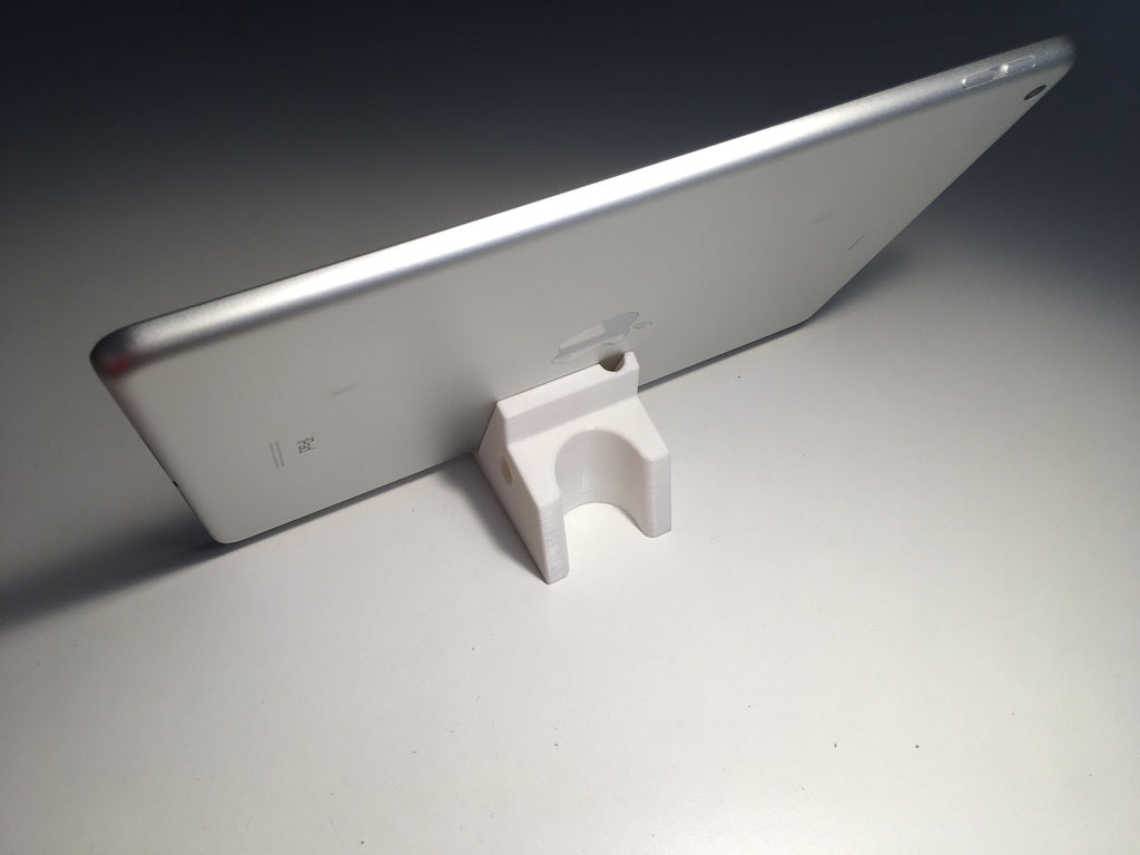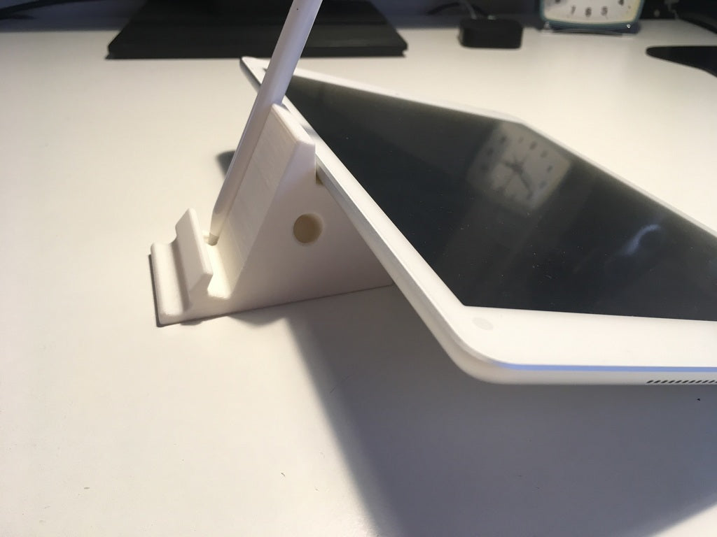 Dvoustranný stojánek pro iPad s držákem na Apple Pencil a jeho krytkou. Stojan dokáže iPad udržet v pohodlné poloze pro sledování videí, zatímco držák na tužku Apple Pencil udržuje tužku a její krytku uspořádané a na dosah.