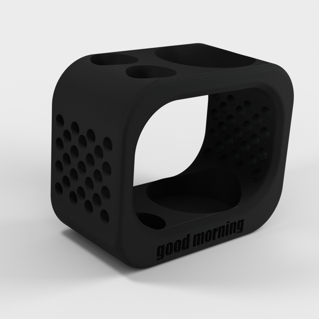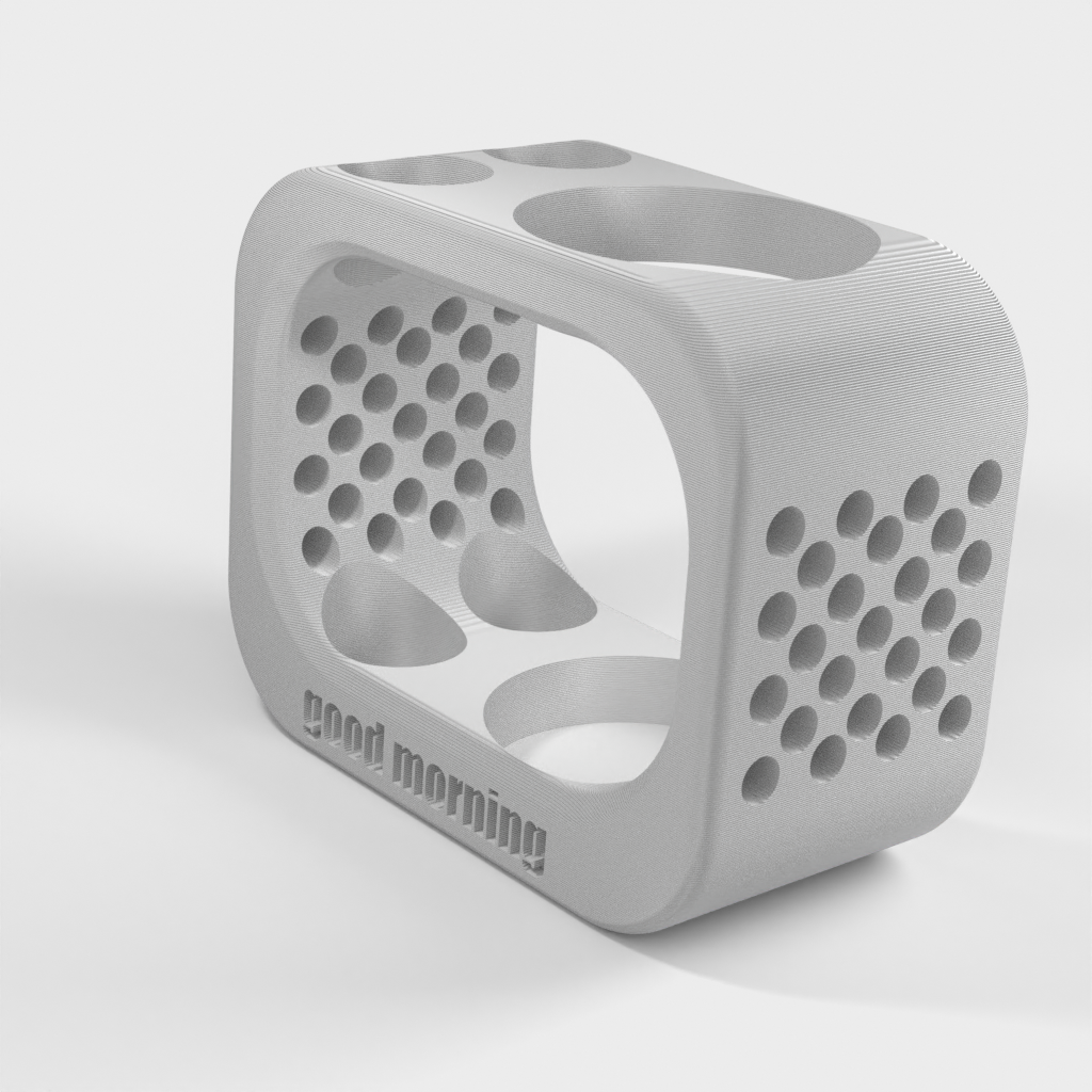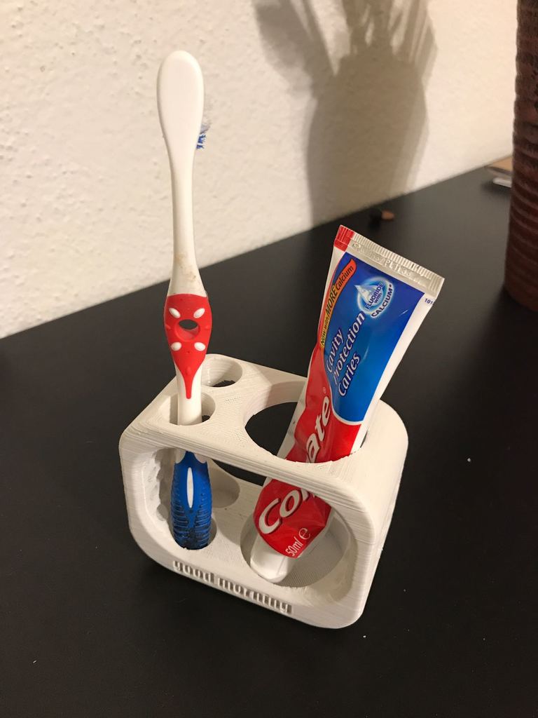 Jednoduchý držák na zubní kartáčky a pastu navržený pro 2 zubní kartáčky a tubu zubní pasty. Stačí si to vytisknout a začít nový den s úsměvem.