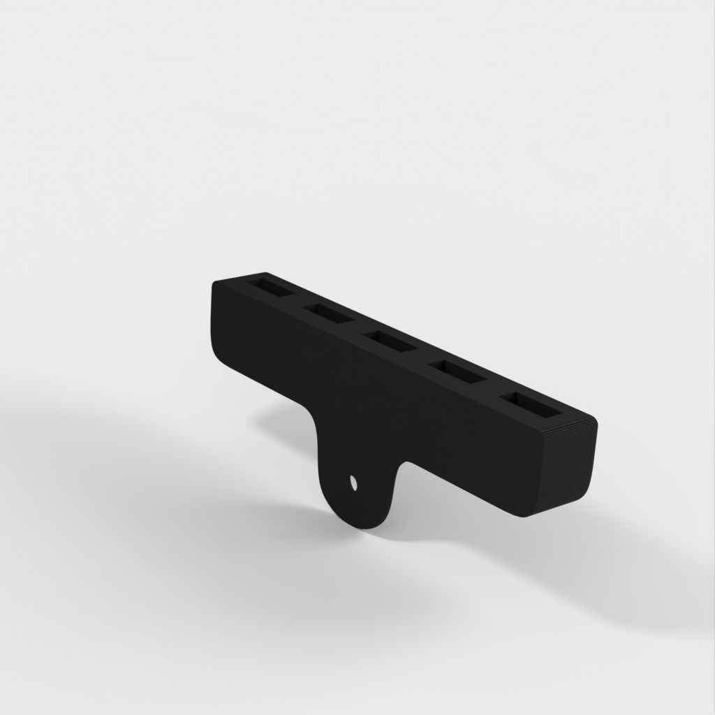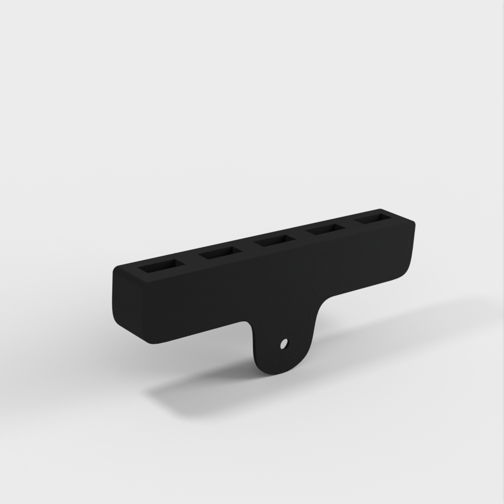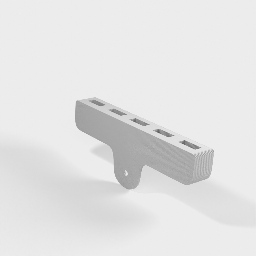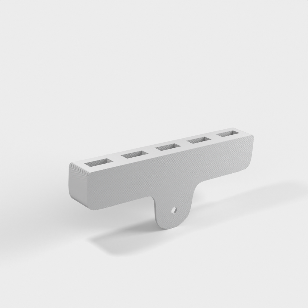 Tento držák USB s prostorem pro 5 kabelů je určen k zavěšení na stěnu vedle pracovního stolu, aby vám kabely nepřekážely, ale byly snadno dostupné. Výrobek je určen k zavěšení směrem dolů a ke stěně se připevňuje pomocí šroubů. Při přišroubování ke zdi je třeba být trochu opatrný, aby nedošlo k rozštípnutí horní části.