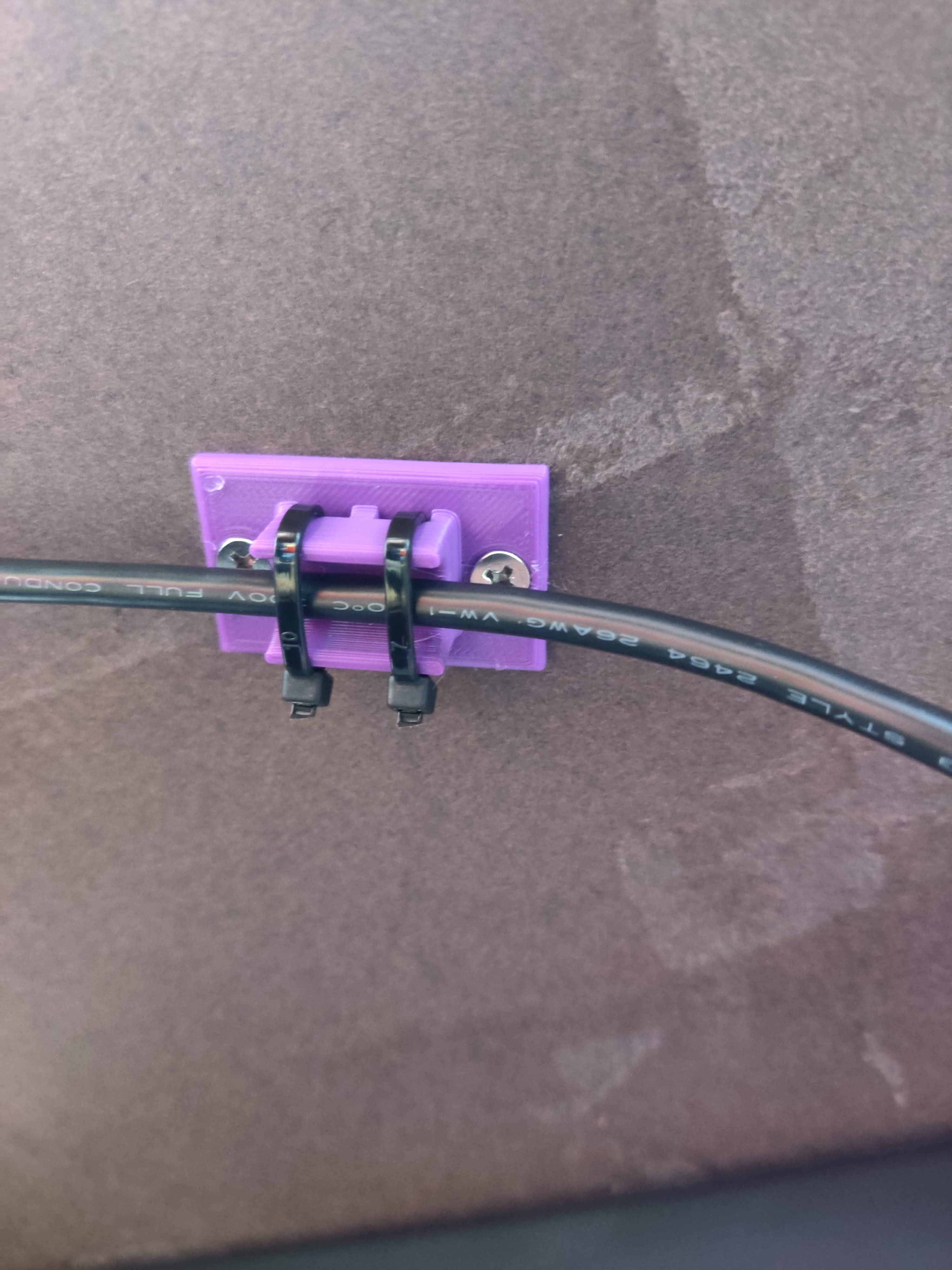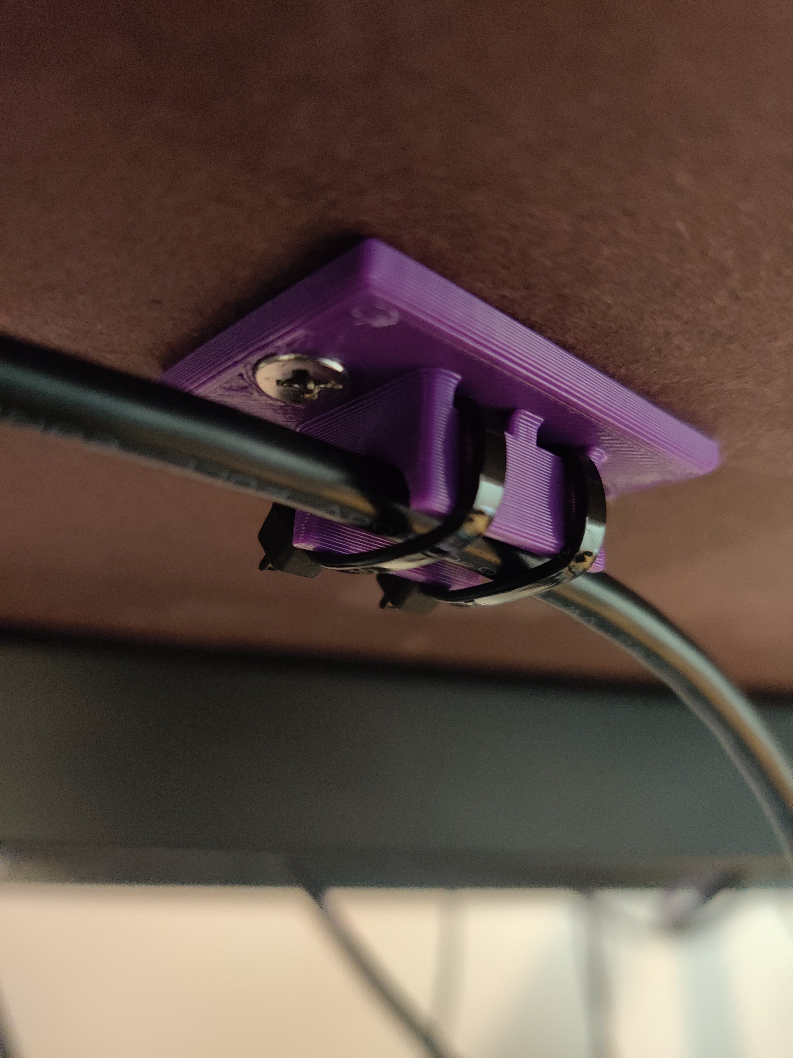 Jedná se o minimalistický organizér kabelů se zipem pro montáž pod stůl. Je určen k trvalému uspořádání kabelů na těžko přístupných místech, která vyžadují úklid. Jeho tisk je rychlý a snadný a na jeden kus se spotřebuje pouze 5,5 gramu filamentu. Tento výrobek lze snadno přišroubovat ke stolu buď pomocí šroubů č. 6 (ekvivalent M3/M3,5), nebo pomocí příkazových pásků pro méně trvalé řešení. Díky dvěma vestavěným slotům pro zipové pásky je tento organizér ideální pro udržení pořádku a úhledného uložení kabelů.