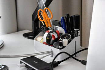 Vytvořte si úhledný a efektivní pracovní prostor s tímto funkčním organizérem na psací stůl. Je navržen tak, aby udržoval pořádek ve vašich drobnostech, jako jsou pera, zápisníky a kancelářské potřeby, a zároveň nabízí inteligentní správu kabelů. Díky vestavěnému držáku kabelů je zajištěno, že vaše důležité vodiče a kabely, jako jsou nabíjecí kabely pro telefony a počítače, jsou vždy na dosah a nepadají dolů. Tento praktický držák kabelů eliminuje změť kabelů a přispívá k uspořádanějšímu psacímu stolu. Ideální organizér na psací stůl, který promění neuspořádaný prostor v přehledné a produktivní prostředí.