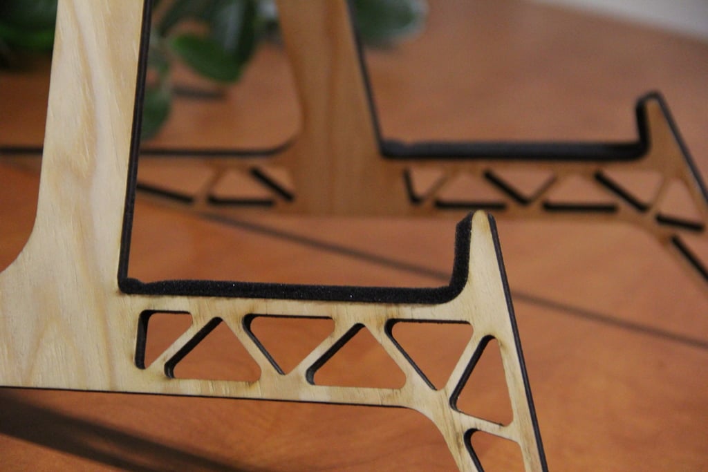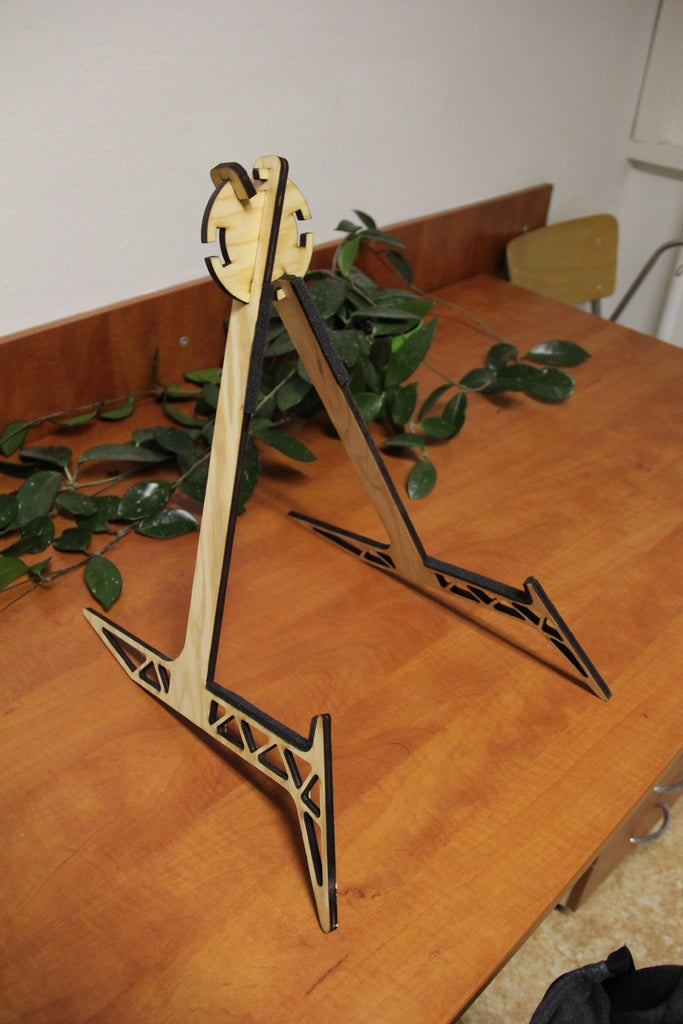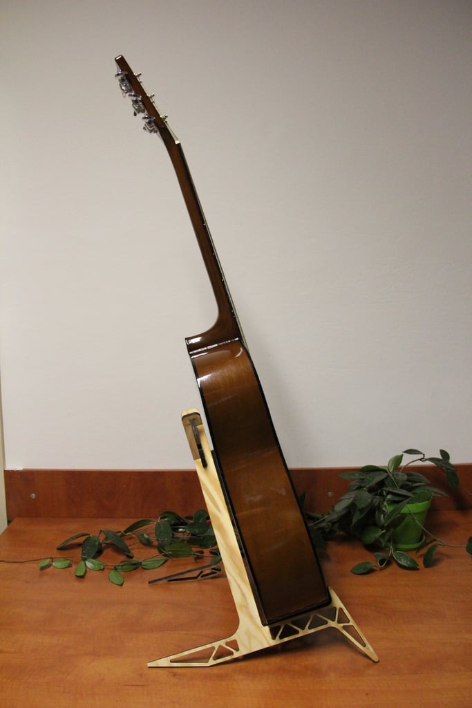 Tento laserem řezaný kytarový stojan je navržen speciálně pro akustické kytary, což zajišťuje stabilní a bezpečné umístění vašeho nástroje. Stojan je určen pro kytary s tělem, které se vejde do rozměrů 500 x 440 x 110 mm, s těžištěm ve výšce přibližně 400 mm. Centrální kulatý držák umožňuje nastavit úhel nohou na 30 nebo 45 stupňů, což nabízí flexibilitu při nastavení. Pro ochranu kytary před poškrábáním se doporučuje obložit okraje měkkým materiálem, jako je akustická pěna. Tento stojan je vyroben z 8mm borovicové překližky a nabízí robustní a stylové řešení pro uložení vaší akustické kytary.