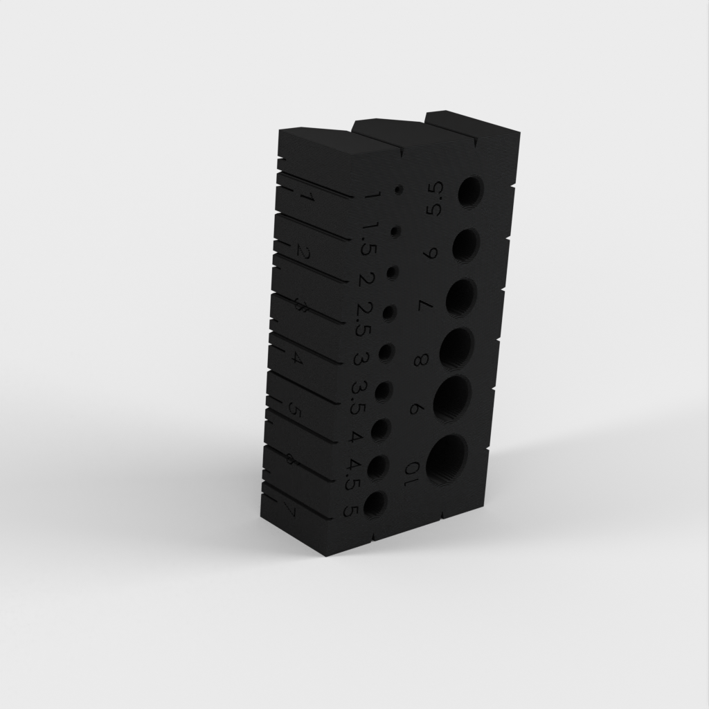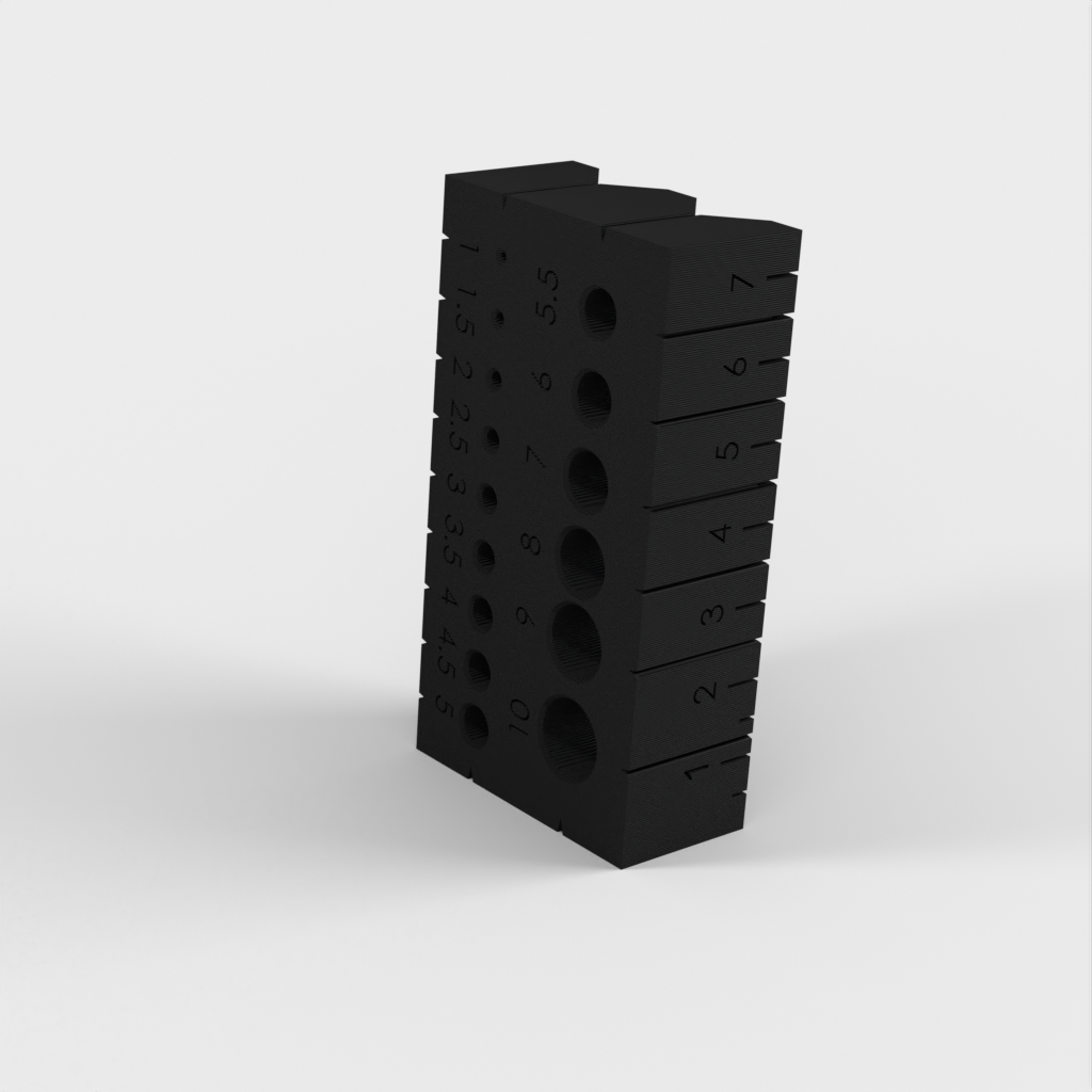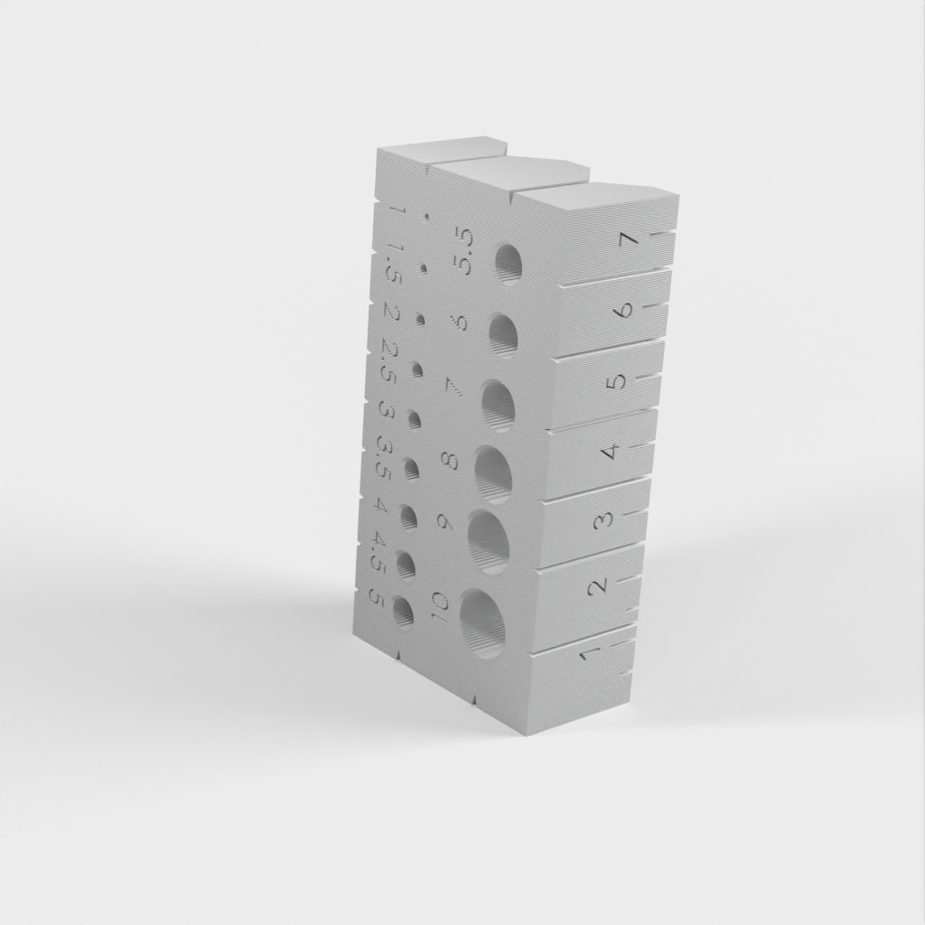 Jeho design zahrnuje 15 otvorů v běžných velikostech vrtáků od 1 do 10 mm. Značky na stranách usnadňují zajištění správného vyrovnání.