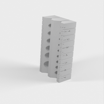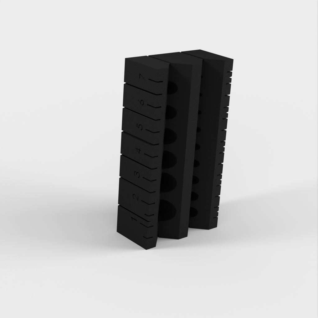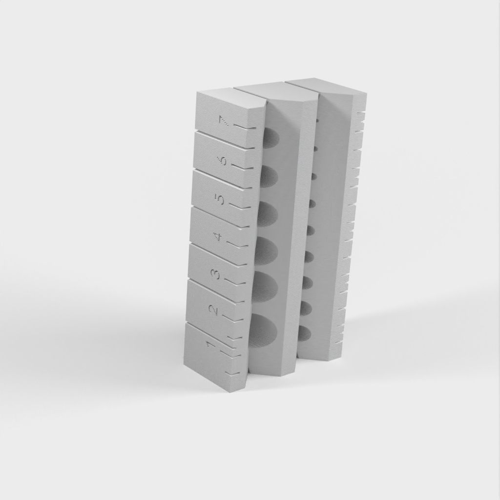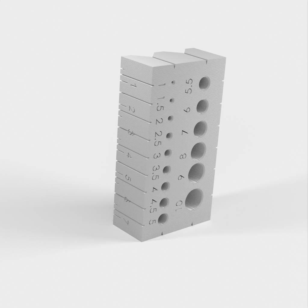 Jeho design zahrnuje 15 otvorů v běžných velikostech vrtáků od 1 do 10 mm. Značky na stranách usnadňují zajištění správného vyrovnání.