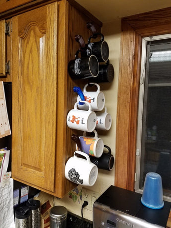 Tento funkční závěs na šálky na kávu je navržen tak, aby poskytoval přehledné uložení vašich šálků na kávu. Závěs pomáhá udržet vaše šálky uspořádané a snadno dostupné, čímž uvolňuje místo na vašich policích nebo kuchyňské lince. Lze jej diskrétně namontovat na stěnu nebo na bok skříně a přispívá k úhlednému a uklizenému výrazu v kuchyni nebo v kanceláři.