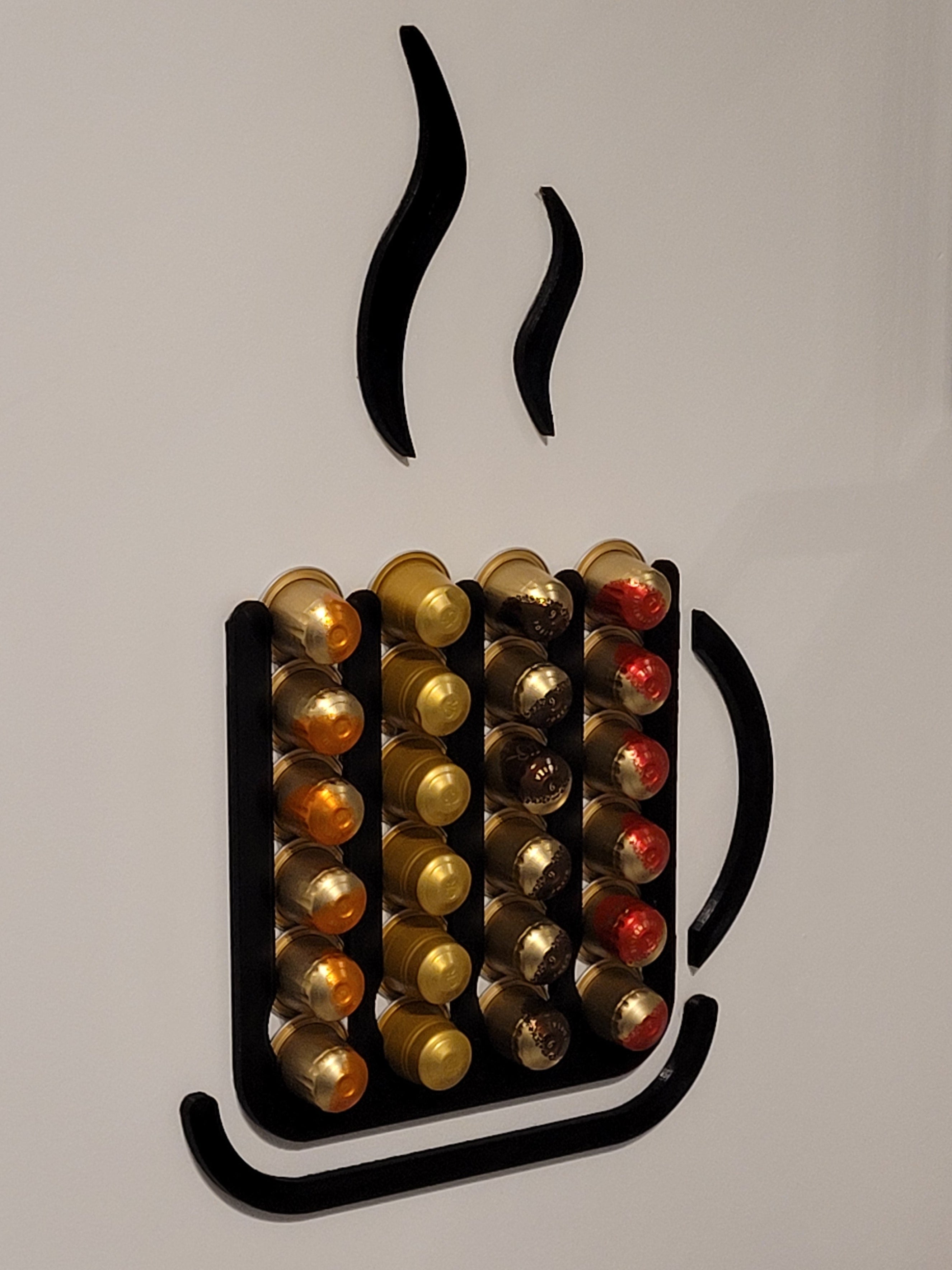 Toto je dávkovač na kapsle Nespresso; ve tvaru šálku a určený k zavěšení na zeď.
