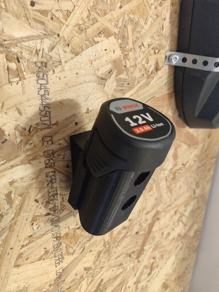 Jednoduchý nástěnný držák pro baterie Bosch 12V, takže je lze namontovat na zeď.