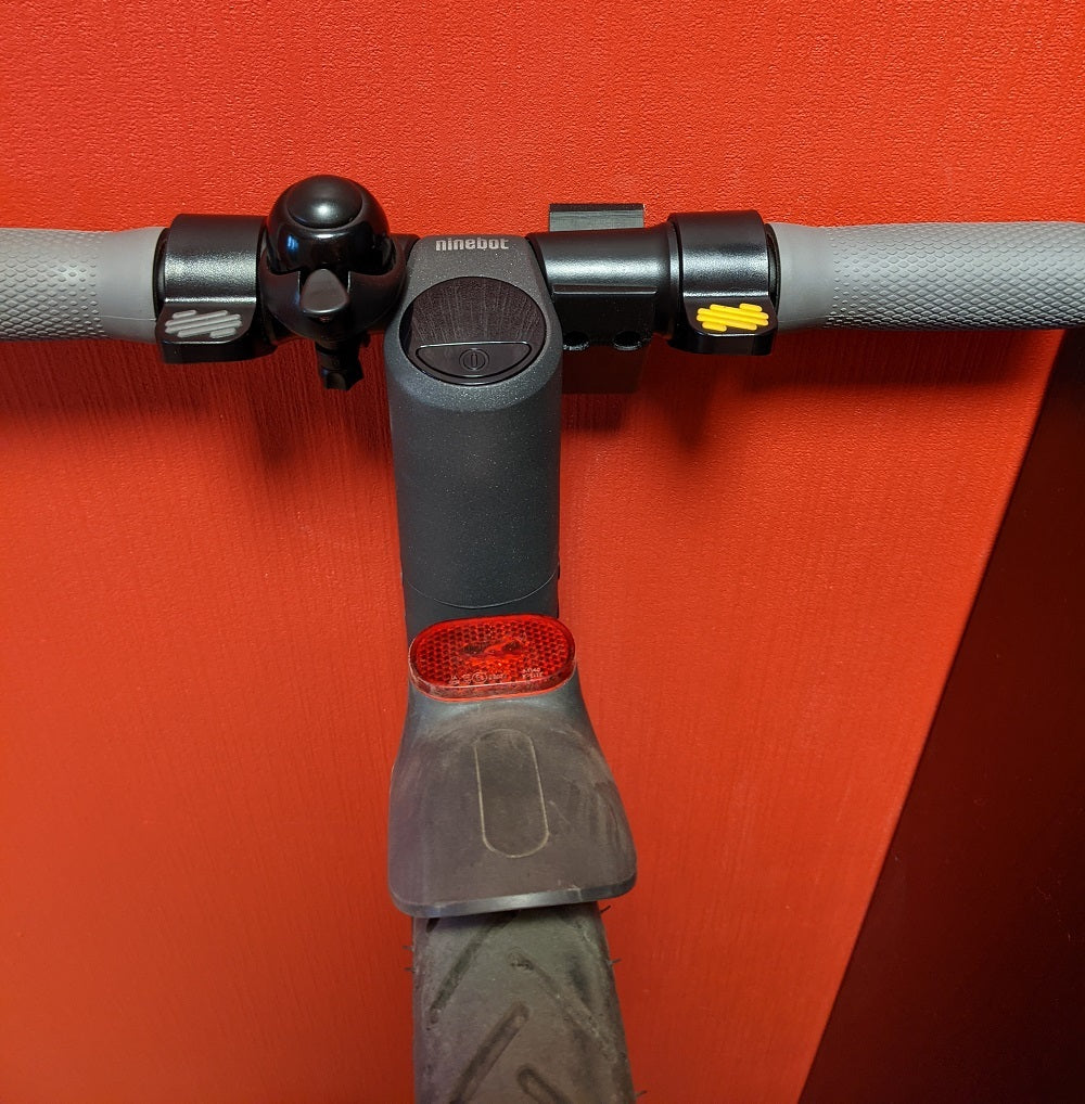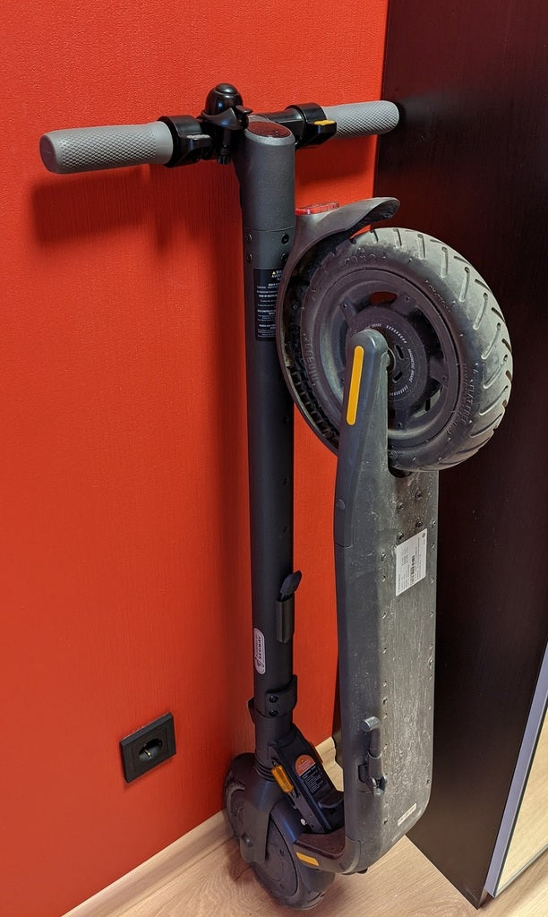 Jednoduchý 3D tištěný nástěnný držák pro Ninebot e25, aby mohl stát u zdi a zabírat co nejméně místa.