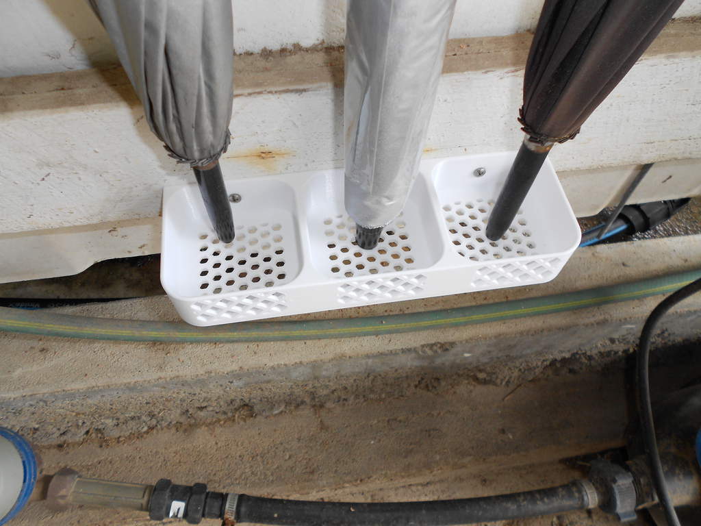 Skladuje deštníky efektivně s tímto nástěnným držákem na deštníky, který pojme až tři deštníky. Design obsahuje dvě různé možnosti pro spodní montáž; jedna s odtokem na podlahu a druhá se s pevným dnem, která zachycuje kapky z mokrých deštníků. Tato funkčnost usnadňuje udržování oblasti kolem držáku suché a čisté.