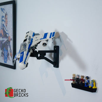 Tento nastavitelný nástěnný držák je navržen speciálně pro Star Wars New Republic E-Wing 75364. Umožňuje vystavit model v různých úhlech a orientacích, čímž zvýrazňuje detaily. Držák navíc obsahuje samostatné uchycení pro minifigurky a usnadňuje opětovné sejmutí sady ze zdi.