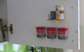 Tento držák na sklenice na koření je navržen tak, aby udržoval vaše sklenice na koření Verstegen uspořádané a snadno dostupné uvnitř vaší kuchyňské skříňky. Připevněním držáku na vnitřní stranu dvířek skříně nebo na zeď můžete optimálně využít prostor a vytvořit efektivní úložný prostor pro koření. Sklenice jsou bezpečně upevněny, takže je snadno najdete při vaření. Toto řešení přispívá k udržování pořádku v kuchyni a uvolňuje místo na policích nebo deskách.