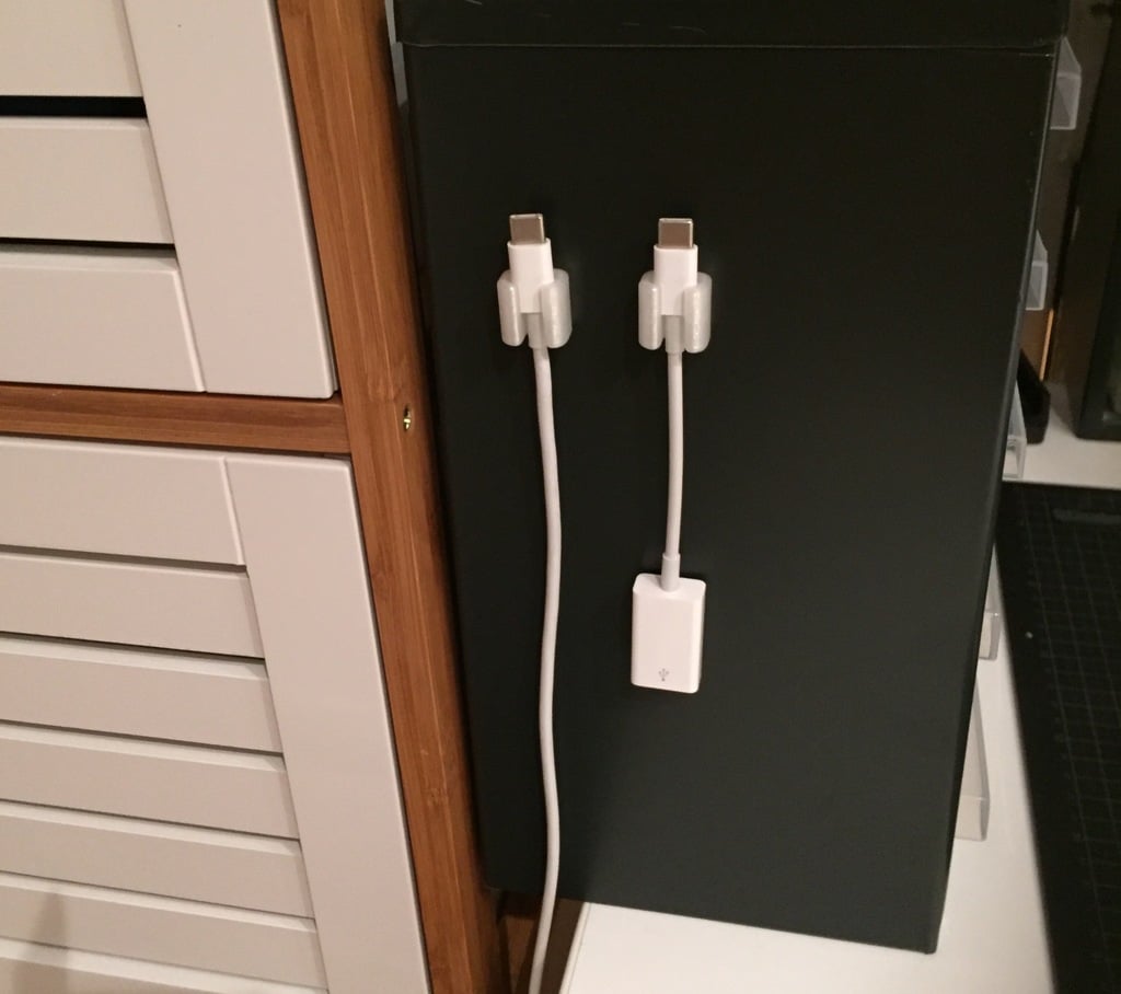 Tento držák je navržen tak, aby poskytoval praktické řešení pro uložení nabíjecího kabelu Apple USB-C. Pomáhá udržovat váš pracovní prostor uspořádaný tím, že zajišťuje, že je kabel shromážděn a snadno dostupný, když potřebujete nabít svůj MacBook nebo jiné zařízení USB-C. S tímto chytrým držákem kabelů se vyhnete zamotaným drátům a nepořádku na stole.