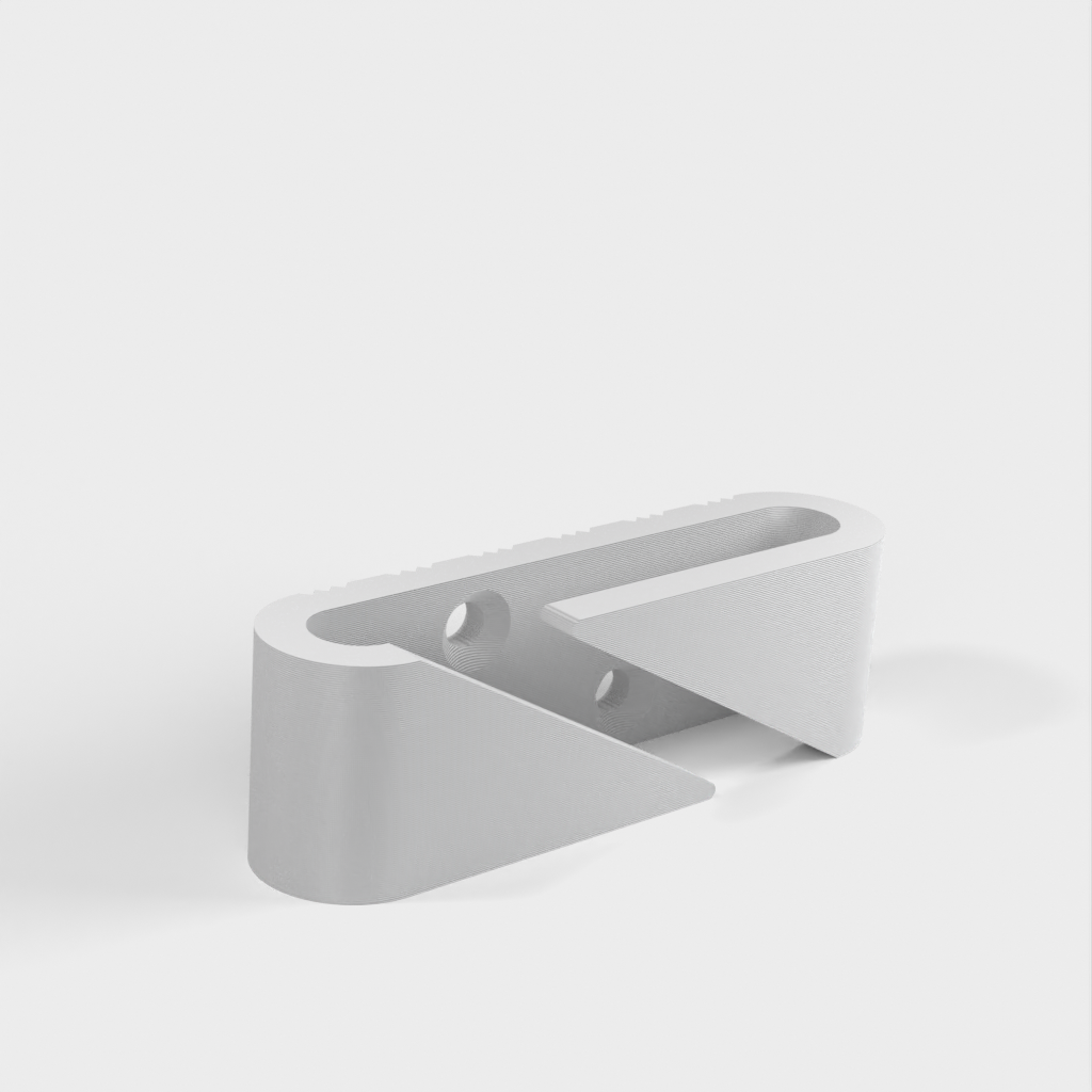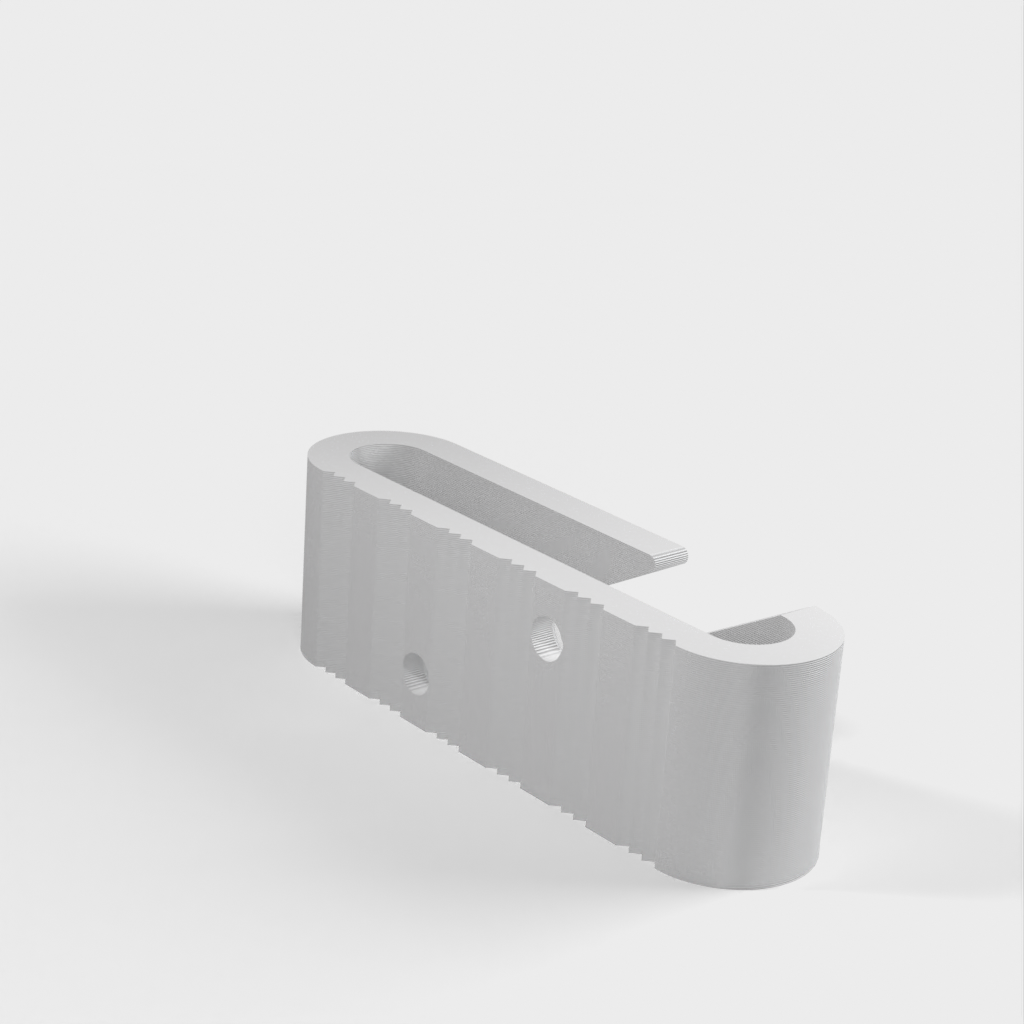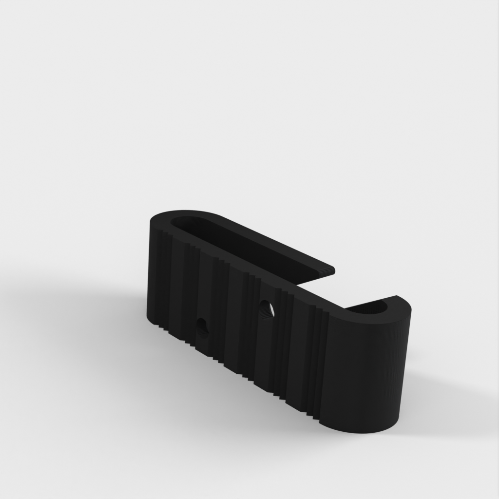 Držák kabelu, který lze připevnit k povrchu šrouby pomocí zahloubených otvorů nebo dokonce horkým lepidlem díky jeho drážkám.