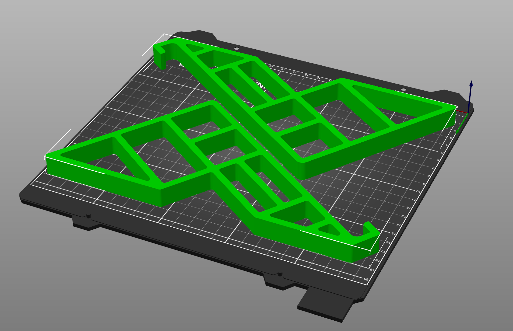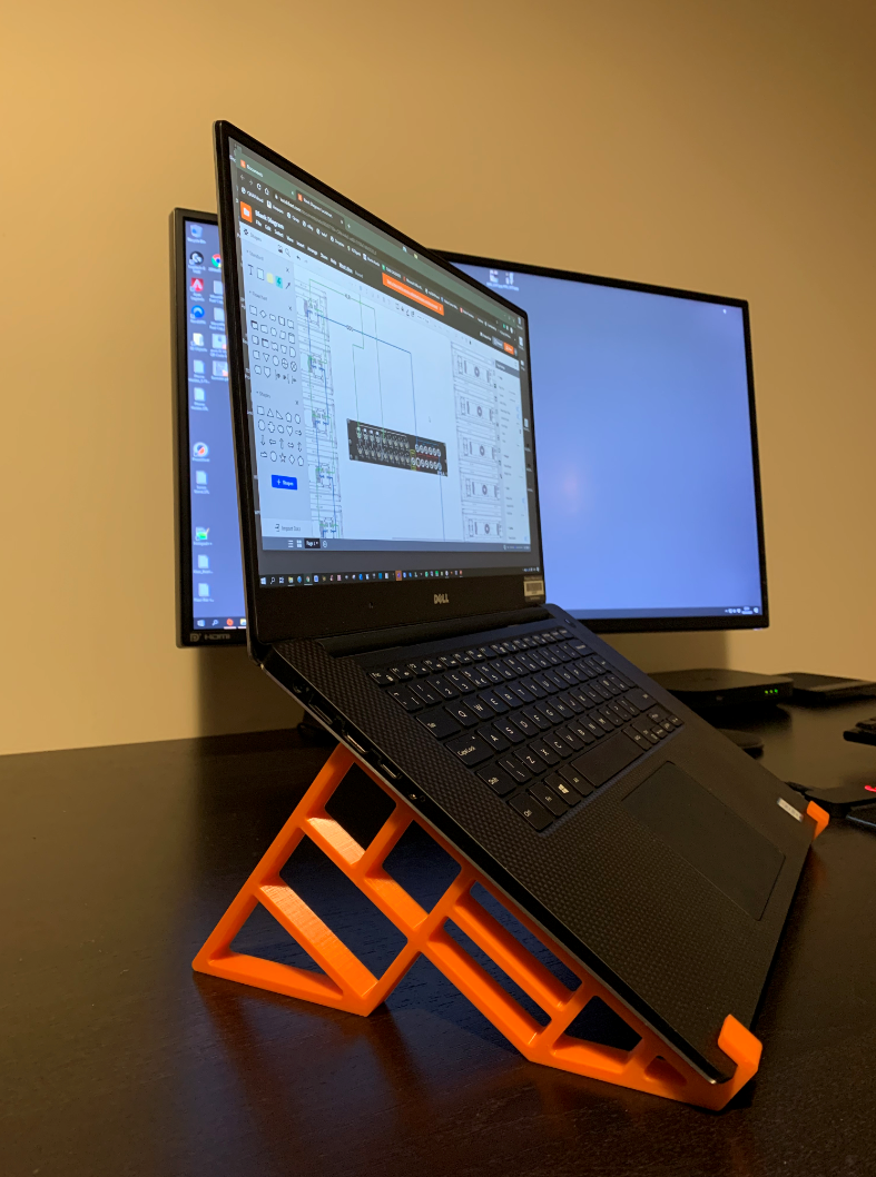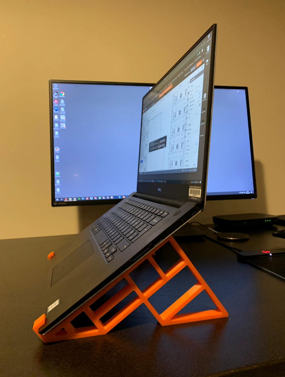 Stojan pro notebook Dell XPS 15. Stojan zvedne obrazovku na přibližně 170 mm a při úplném zavěšení ji umístí do ideálního úhlu pro plochou obrazovku. Stojan dokonale padne na lůžko MK3 a je potištěn SUNLU PETG. Jeho tisk trvá přibližně 9 hodin a používá 3 obvody s úhlem vyplnění 55 stupňů a gyroidní výplní 15 %.