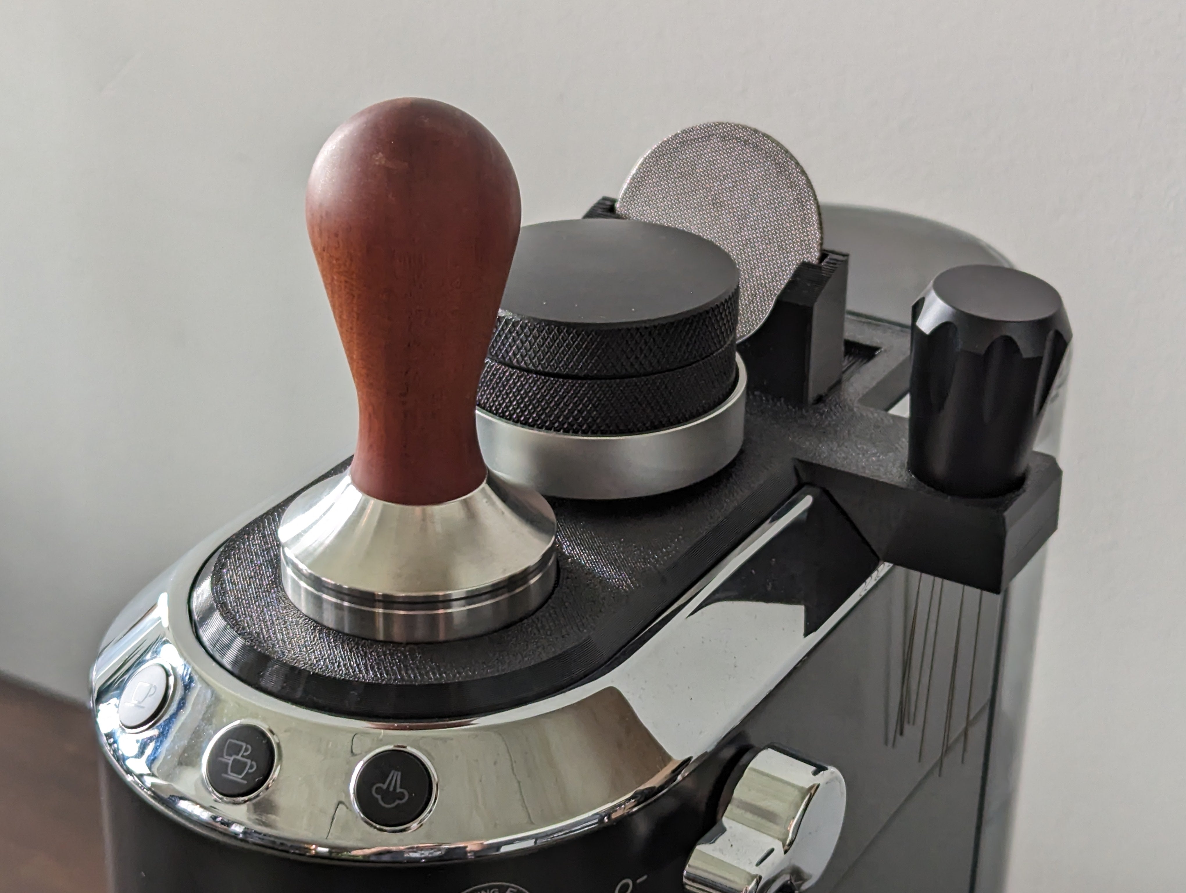 Dodává se s praktickým držákem nástrojů pro dvě 51mm nářadí, což umožňuje uložit jak WDT nástroj, tak i dvě obrazovky puck. Tento příslušenství nejen že poskytuje upravenější povrch, ale také zajišťuje, že vše je po ruce, když potřebujete připravit svou dokonalou šálek kávy.