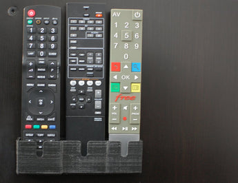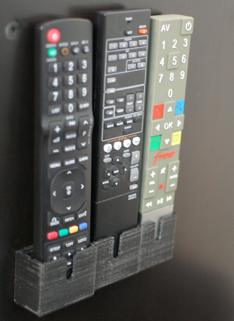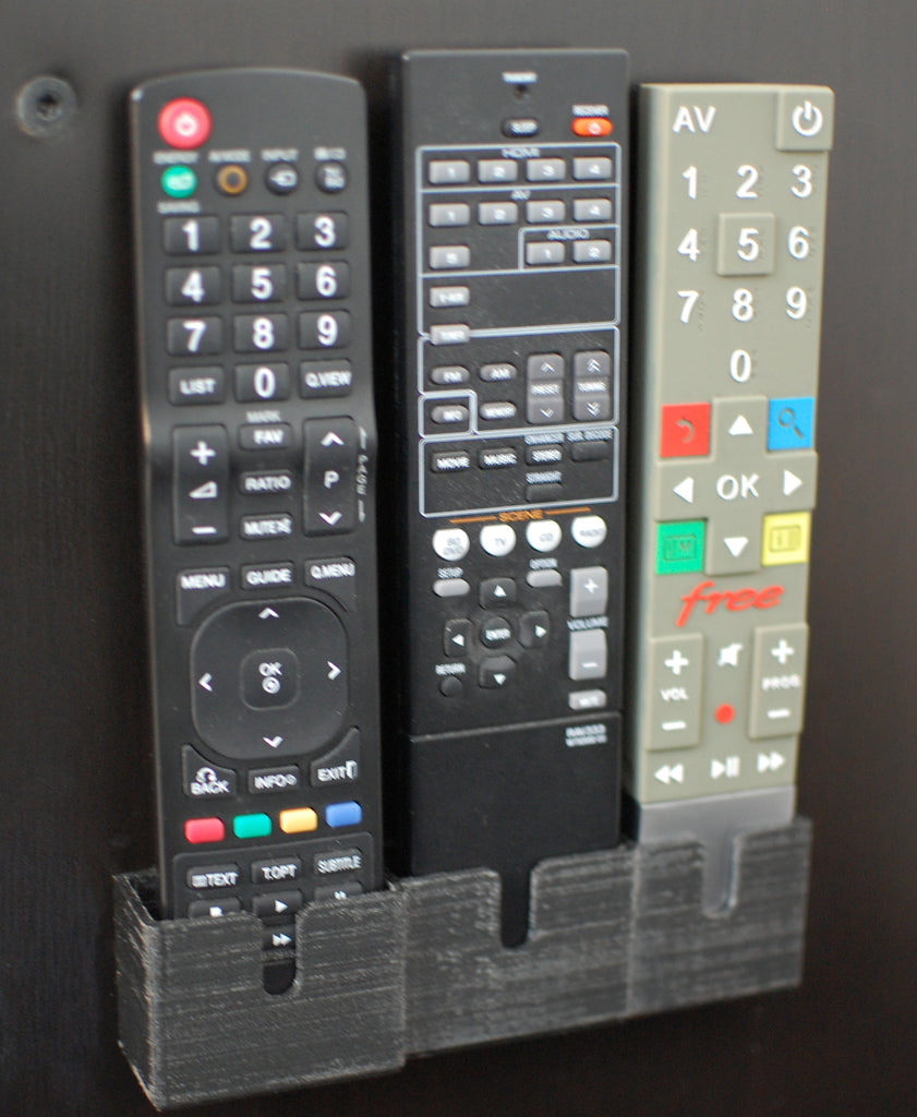 Tento praktický držák na dálkové ovládání je navržen tak, aby vytvořil pořádek a snadný přístup k nejdůležitějším dálkovým ovladačům. Držák je speciálně přizpůsoben pro Freebox Revolution, LG 42LD420 TV a zesilovač Yamaha RX-V367 a poskytuje těmto zařízením vyhrazené místo.