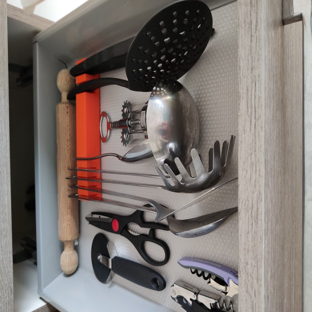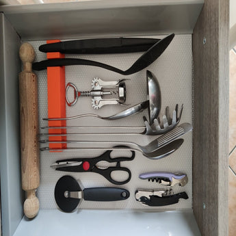 Tato vložka do zásuvky je navržena tak, aby vytvořila pořádek a optimalizovala úložiště ve vašich kuchyňských zásuvkách. Díky sedmi samostatným přihrádkám můžete snadno třídit a ukládat širokou škálu kuchyňských pomůcek, jako jsou příbory a malé vychytávky. To poskytuje jasný přehled a zajišťuje, že rychle najdete to, co hledáte, aniž byste museli prohrabávat. Pro ty, kteří provádějí důkladný „průzkum konkurence“ pro efektivní organizační řešení pro kuchyň, nabízí tato vložka praktický způsob, jak zlepšit funkčnost. I když je ideální pro nářadí, přispívá k celkovému pořádku v zásuvce, stejně jako „organizér na koření“ udržuje pořádek v koření, a tím podporuje uklizenější a efektivnější kuchyňské prostředí.