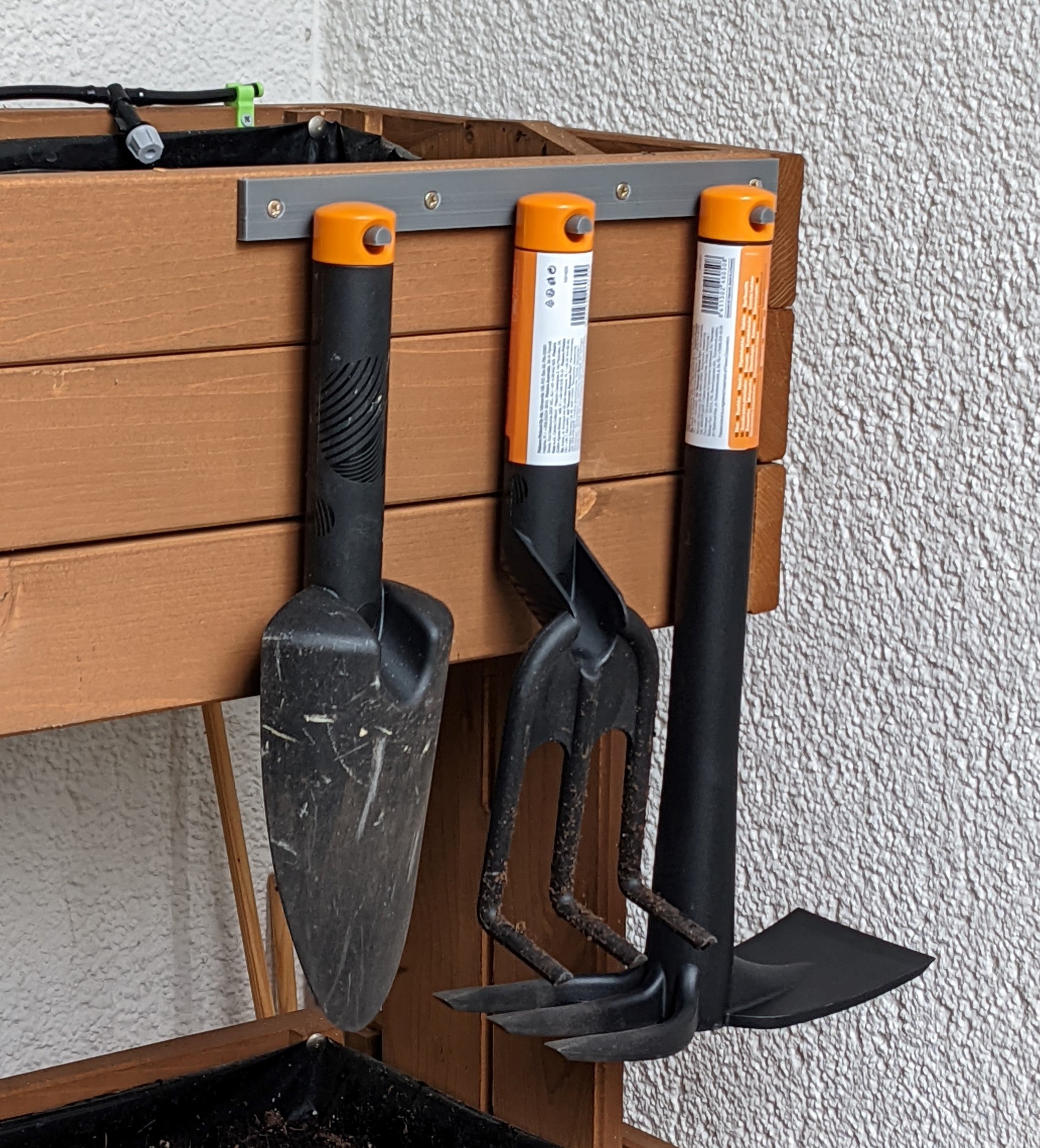 Tento nástěnný držák je určen pro zahradní nářadí Fiskars. Držák lze připevnit přímo na zeď pomocí 4 šroubů. Zahradní nářadí Fiskars pak lze snadno umístit do držáku, díky čemuž bude vaše dílna, kůlna nebo pracovní vozidlo uklizenější.