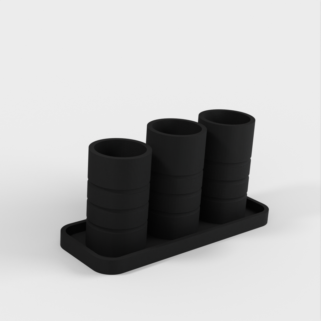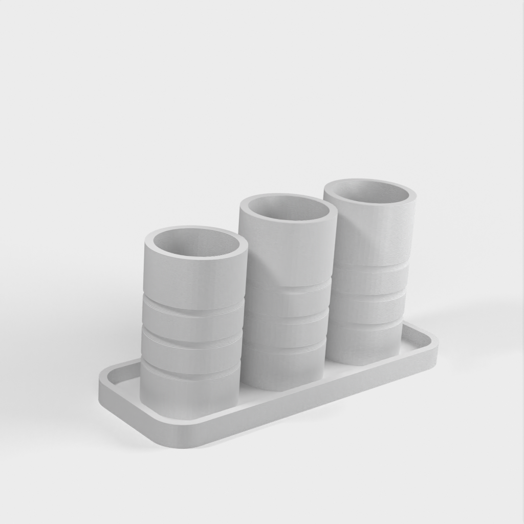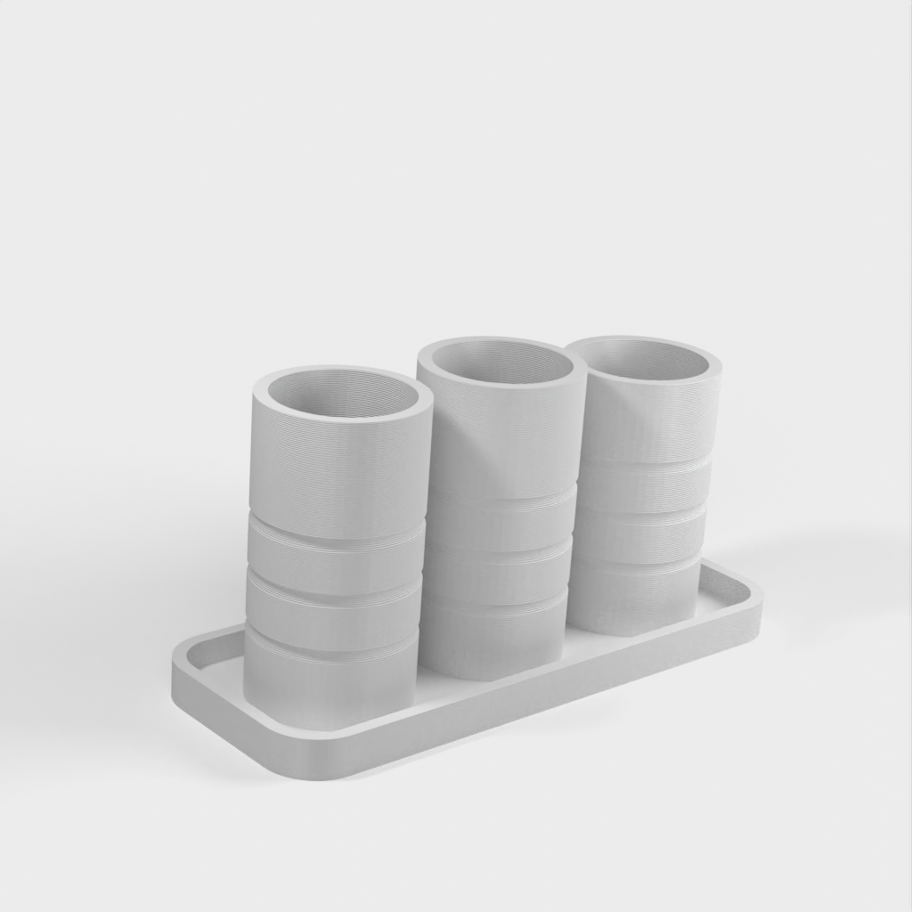 Jednoduchý koupelnový organizér se dvěma hlavními držáky na zubní kartáčky a třetím na čisticí tyčinky nebo jiné předměty. Pomůže vám udržet pořádek a organizaci v koupelně.