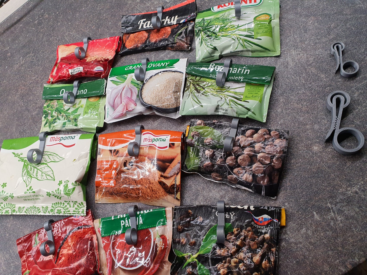 Jedná se o malý klip na uzavírání sáčků - ideální pro skladování koření. Pomocí tohoto klipu můžete snadno a rychle uzavřít sáčky s kořením, což vám pomůže udržet koření déle čerstvé. Je to jednoduchý, ale účinný způsob, jak si uspořádat kuchyň.