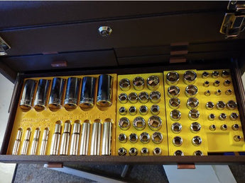 Tento modulární organizér zásuvek je navržen tak, aby přinesl pořádek do vaší dílny a zajistil, že vaše horní díly budou vždy snadno dostupné. Systém pojme kompletní sadu horních dílů v metrických i SAE velikostech a podporuje velikosti pohonů 1/4", 3/8" a 1/2". Je přizpůsoben tak, aby se perfektně vešel do zásuvek v sadě nářadí Kennedy, maximalizuje prostor a poskytuje jasný přehled o vašem nářadí.