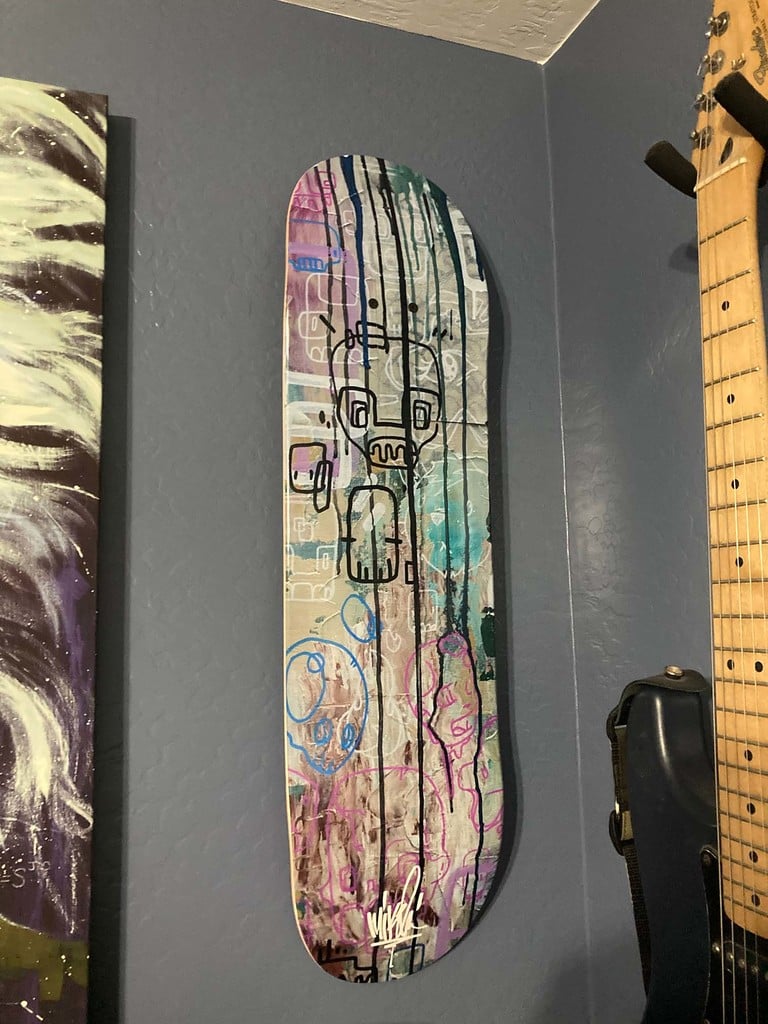 Držák skateboardové desky na zeď je nástěnný držák pro skateboardové desky. Použijte jeden k držení desky svisle nebo dva k držení desky vodorovně. Montážní otvory jsou v jedné rovině s montážními otvory desky, takže lze skrz ně protáhnout šroubovák, jak je znázorněno na obrázku. Ke připevnění desky k držáku byl použit standardní skateboardový hardware.