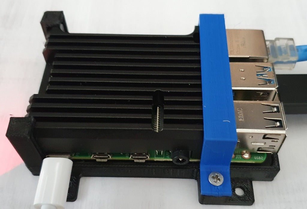Jedná se o montážní držák pro Raspberry Pi 4 v chladicím pouzdře. Tento držák je vhodné používat v mobilních aplikacích, protože je třeba jej připevnit k panelu. Chladicí pouzdro se zasune do držáku a zajistí se svorkou. K dispozici jsou 4 čepy pro připevnění k plochému panelu, žádné konektory nejsou blokovány a chladiče mají plný průtok vzduchu.