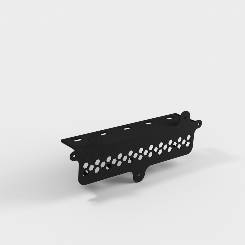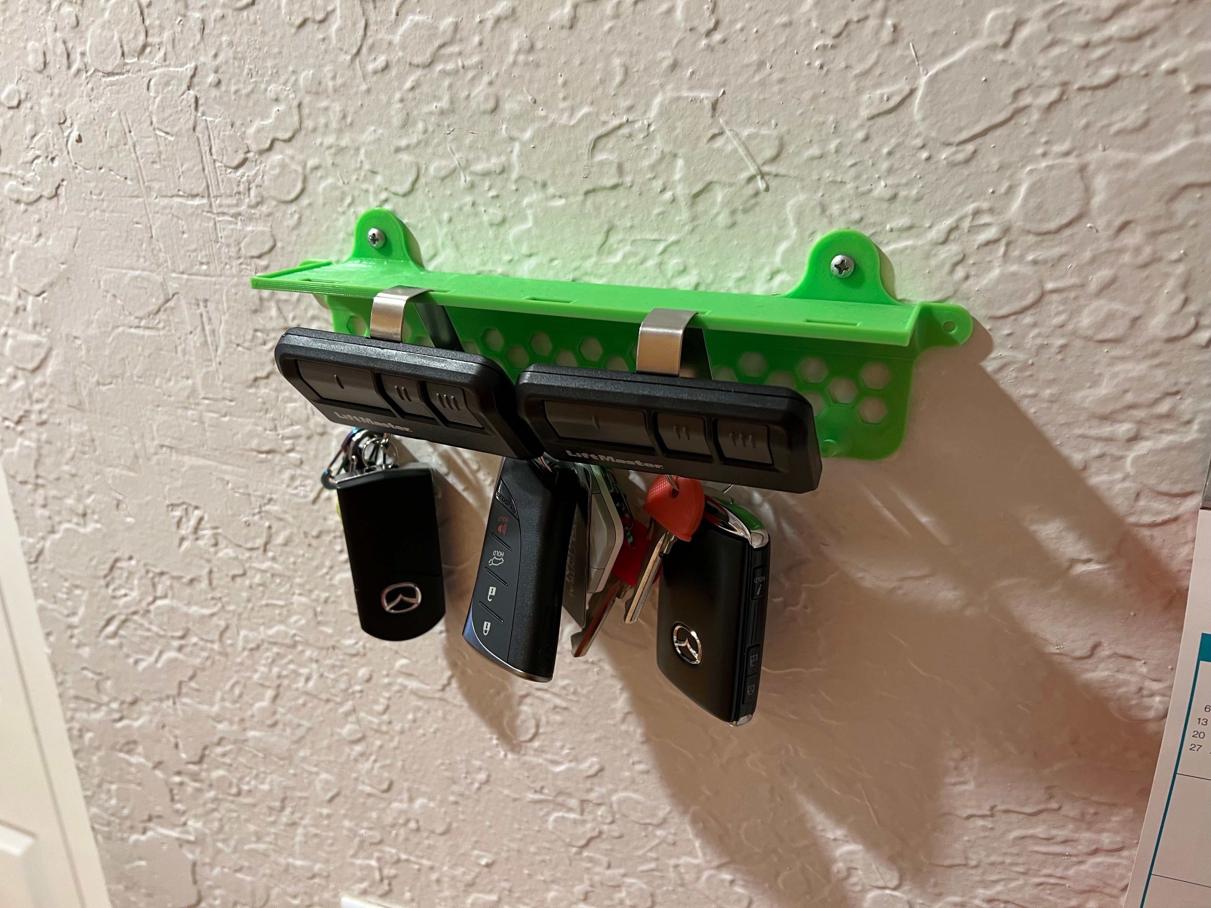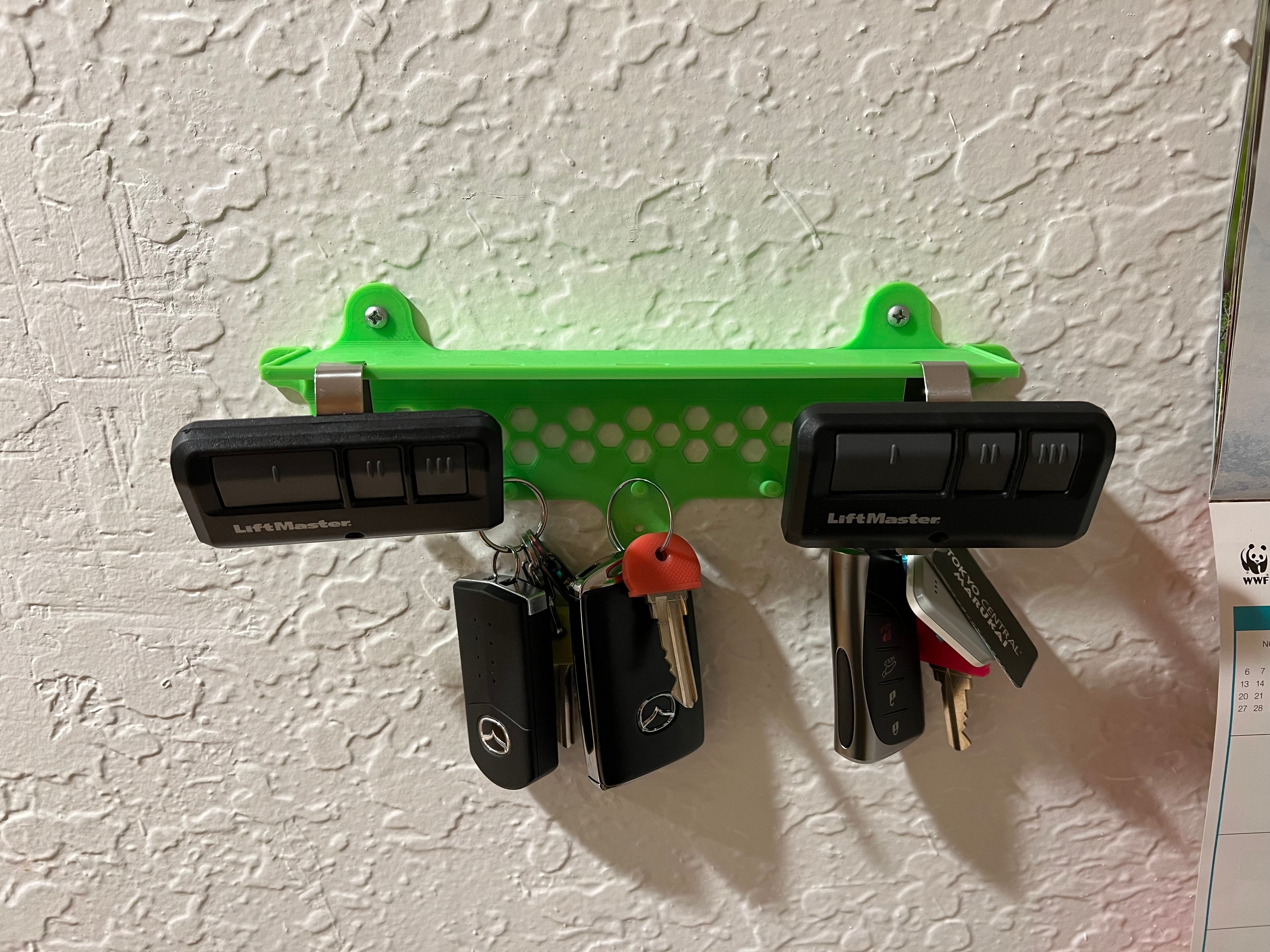 Držák klíčů obsahuje háčky na klíče a specifické výřezy na polici, které jsou vhodné pro uložení otvíráků garážových vrat. Police nabízí další prostor pro drobnosti, jako je peněženka, sluneční brýle nebo seznamy úkolů – praktické řešení, které zajistí, že před odchodem z domova nezapomenete důležité předměty.