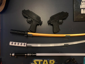 Tento elegantní nástěnný držák je dokonalým řešením pro vystavení vašich 3D tištěných mečů a dalších podobných předmětů.