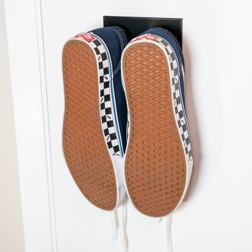 Police na boty na zeď. Botník lze připevnit přímo na stěnu nebo dveře pomocí oboustranné lepicí pásky, díky čemuž je odnímatelný. Je vyrobena tak, aby závěs na lepicích páskách visel mírně pod botníkem, aby je bylo možné v případě potřeby odstranit.