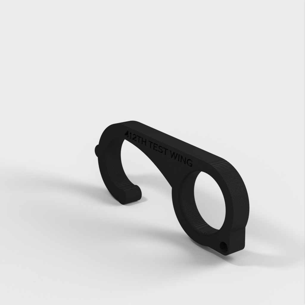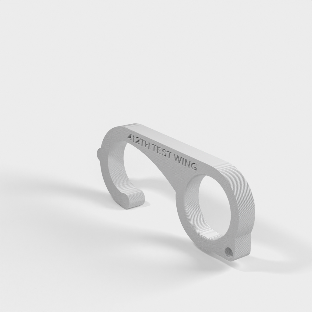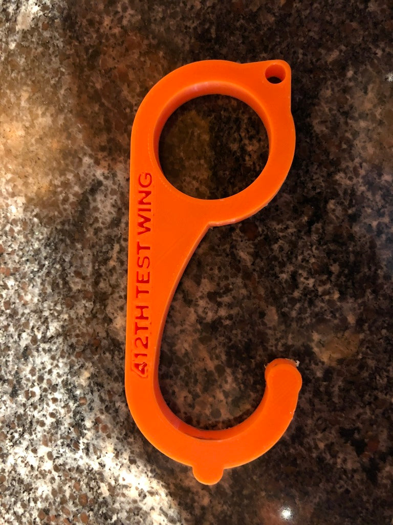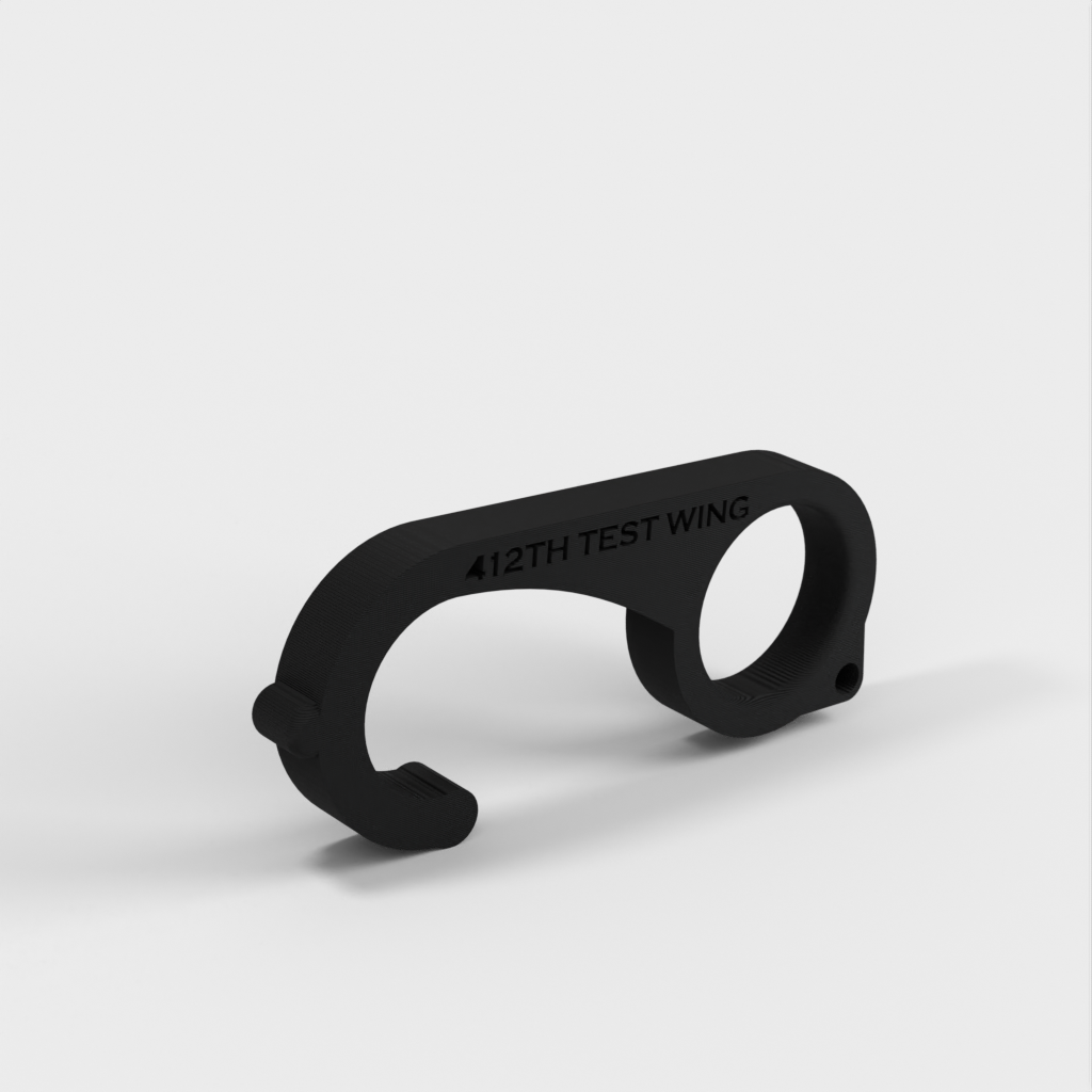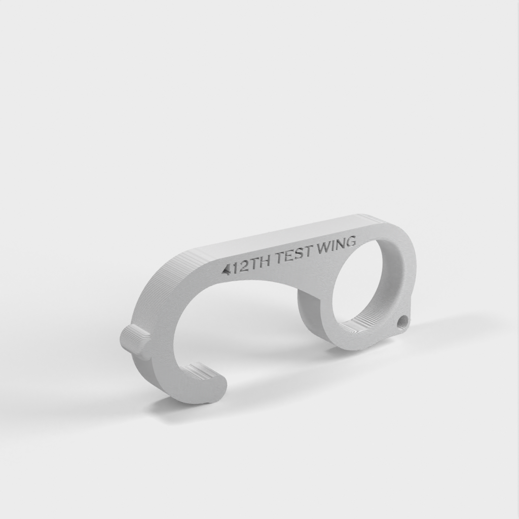 Hák No-Touch vyrobený 412. testovacím křídlem na Edwardsově letecké základně. Tento hák byl testován na různých dveřích a současná iterace konstrukce zatím neselhala.