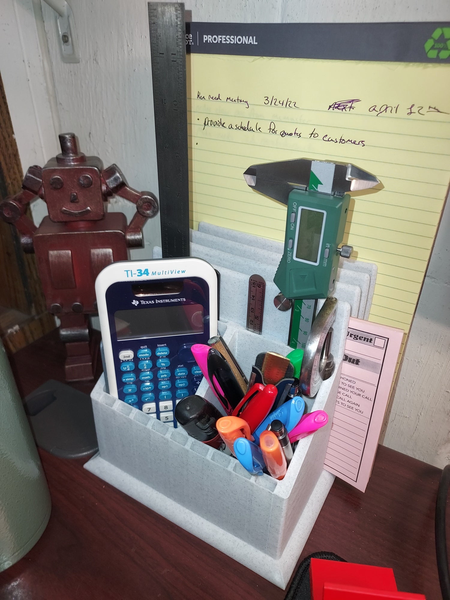 Organizér na psací stůl pomáhá udržovat čistotu a pořádek na pracovním stole. Můžete do něj uložit nezbytné každodenní předměty, jako jsou papíry, složky, měřítka a další drobné potřeby. Je navržen tak, aby se do něj vešel mikrometr a kalibr pro snadné měření a přesnou práci. Tento doplněk udržuje váš pracovní stůl uklizený a organizovaný a zároveň zajišťuje, abyste měli nezbytné předměty vždy na dosah.