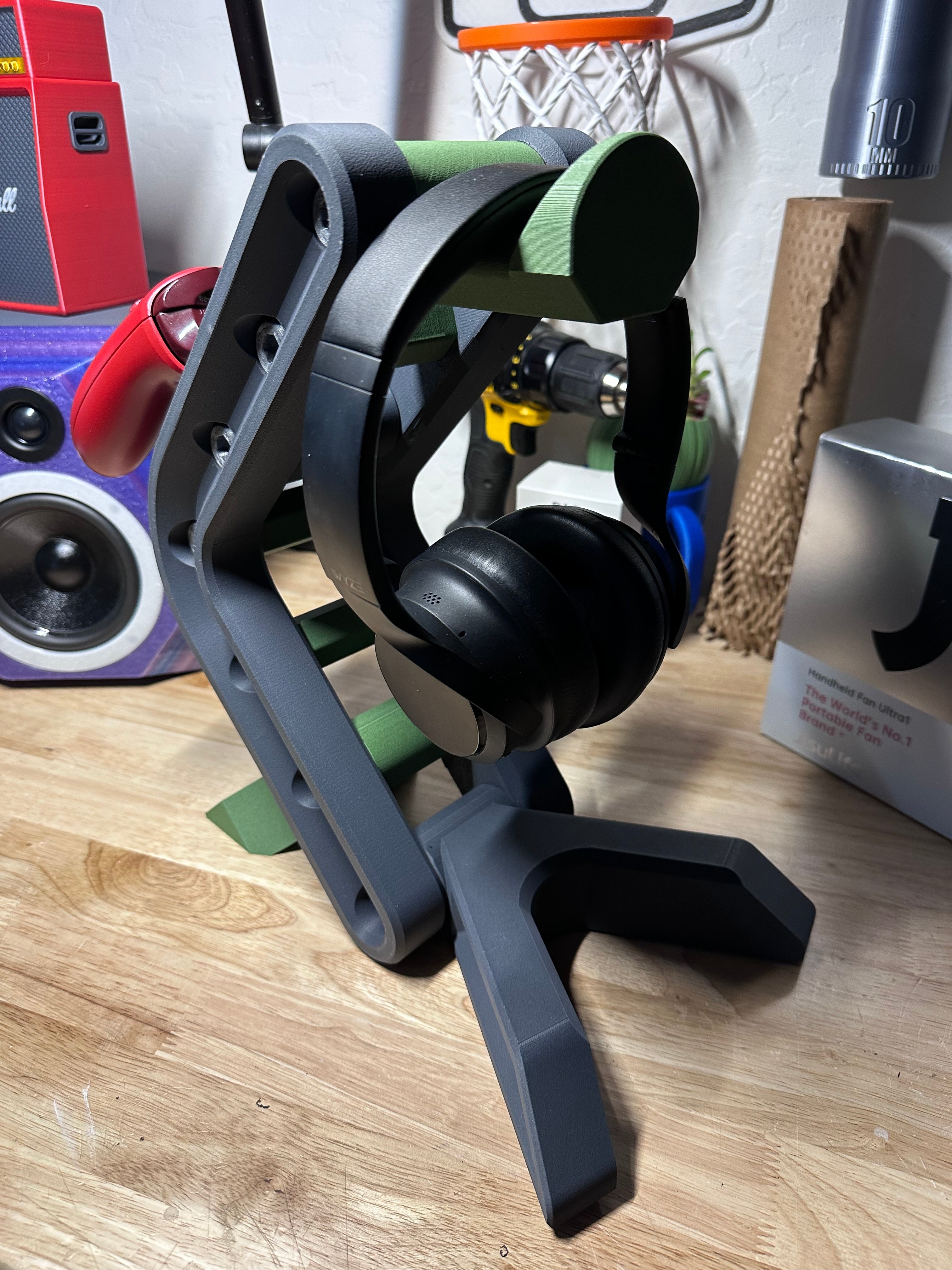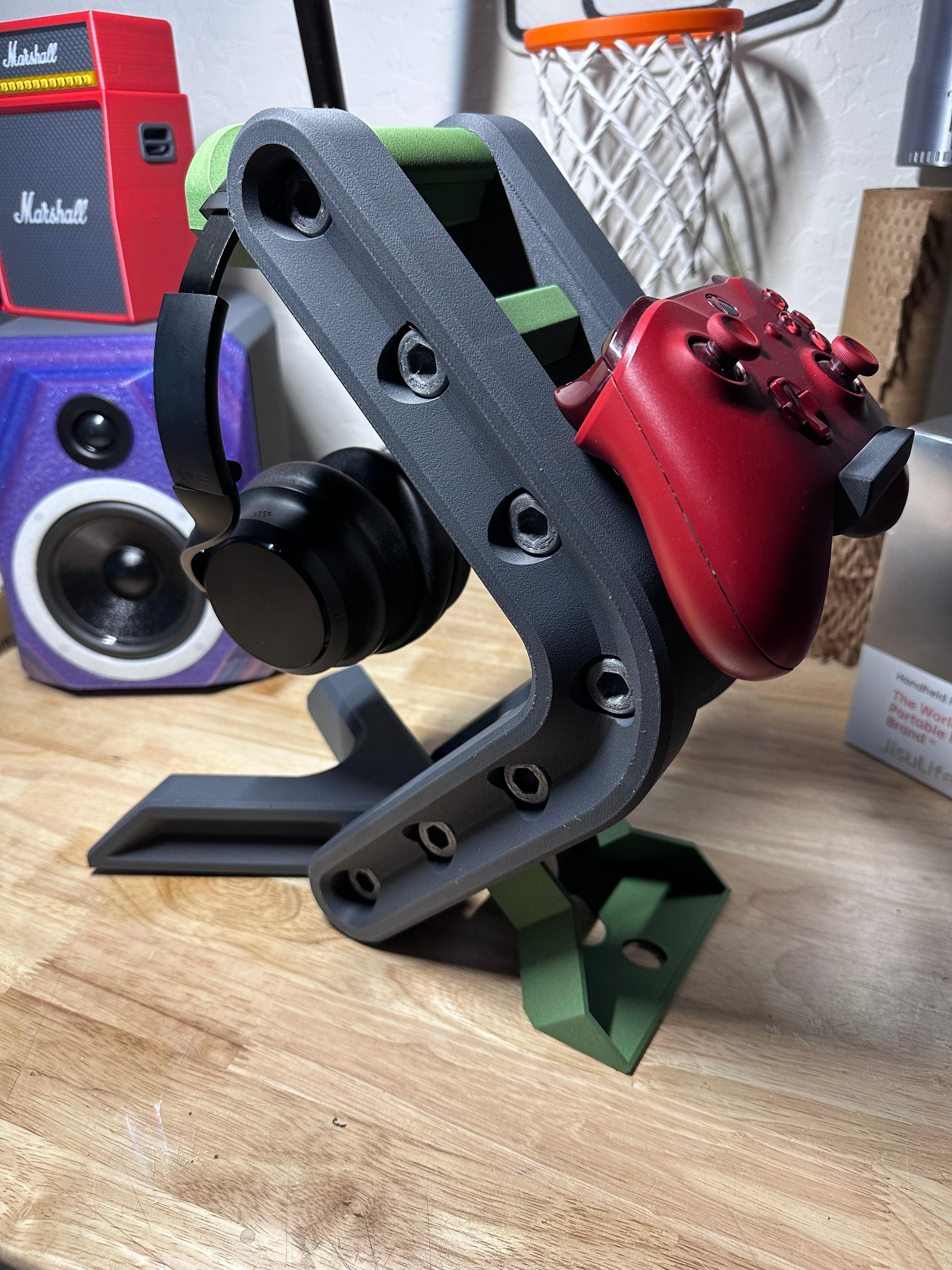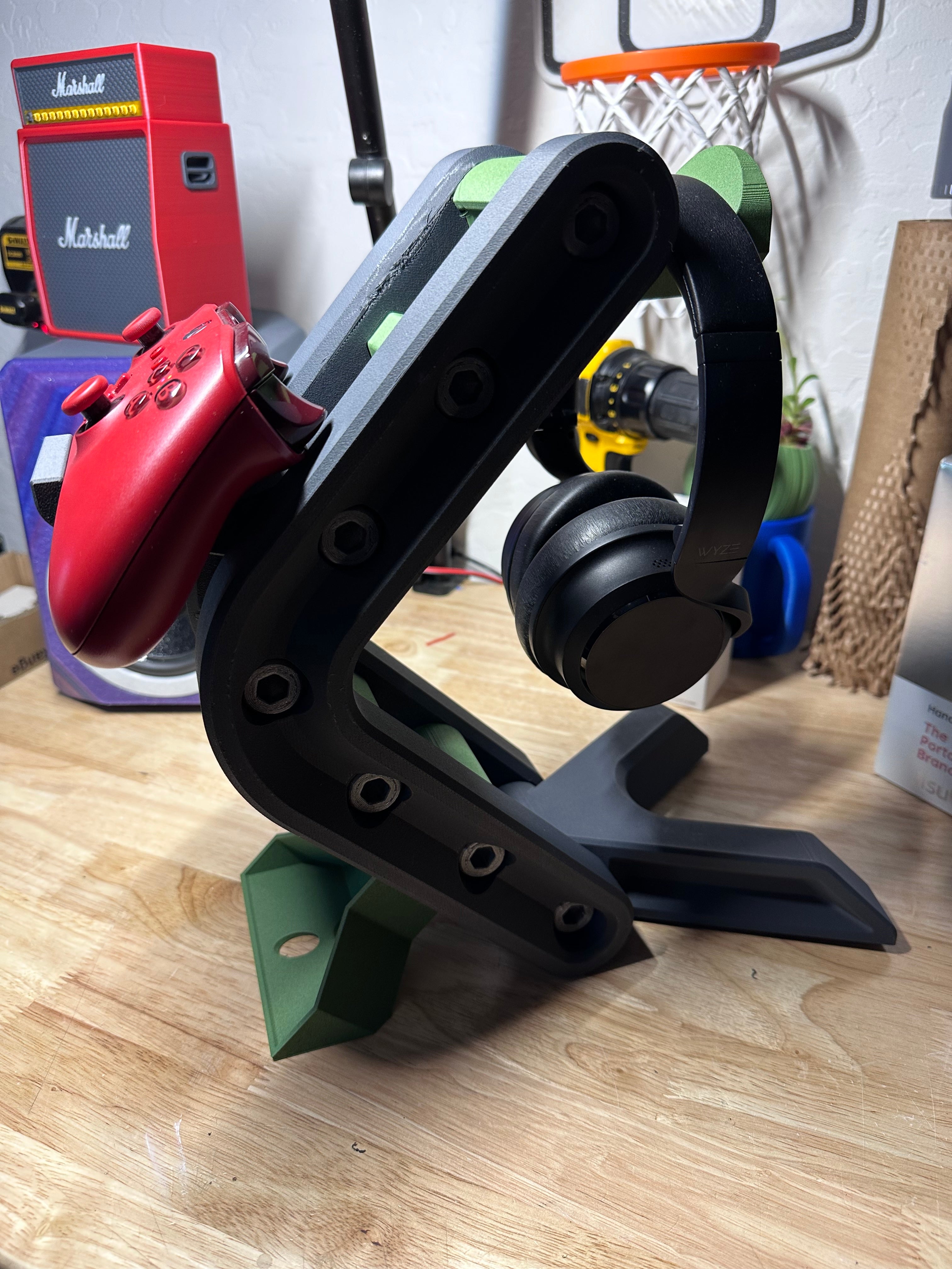 Vylepšete svou herní nebo pracovní stanici tímto funkčním a stylovým stojanem na sluchátka inspirovaným průmyslovým designem. Tento robustní stojan je vytvořen tak, aby poskytoval organizované a esteticky příjemné řešení pro ukládání vašeho zvukového vybavení a herních ovladačů. Ať už jste zapálený hráč, nebo si jen chcete udržet sluchátka a ovladače úhledně na místě, tento stojan nabízí dostatek prostoru a stabilní základnu.