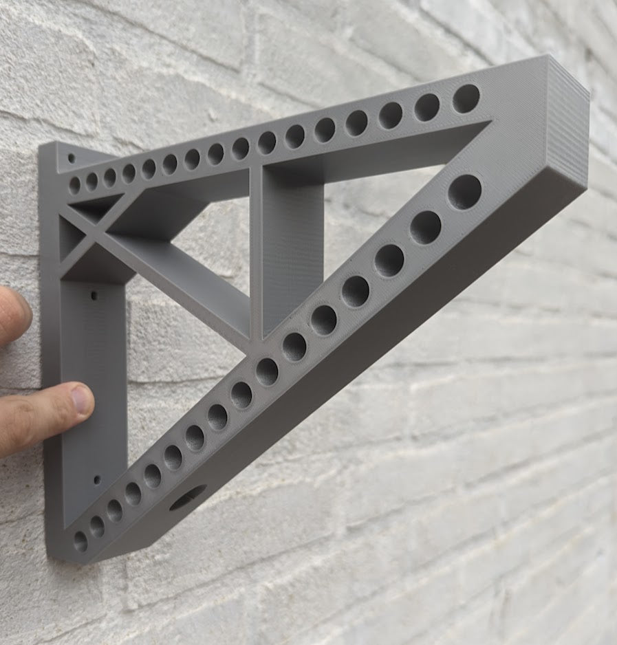 Máte také možnost přidat tištěné držáky polic, které poskytují stabilní podporu pro vaše police. Tato nástěnná kotva je ideální pro vytváření organizovaného prostoru v jakékoli místnosti, od obývacího pokoje až po dílnu, a unese vše od knih a úložných boxů až po vaše oblíbené ozdoby předměty a dekorace. Multifunkční konstrukce s přídavnými otvory navíc umožňuje budoucí úpravy, například upevnění lan ze stropu pro zajištění delších předmětů, jako jsou tyče nebo prkna.