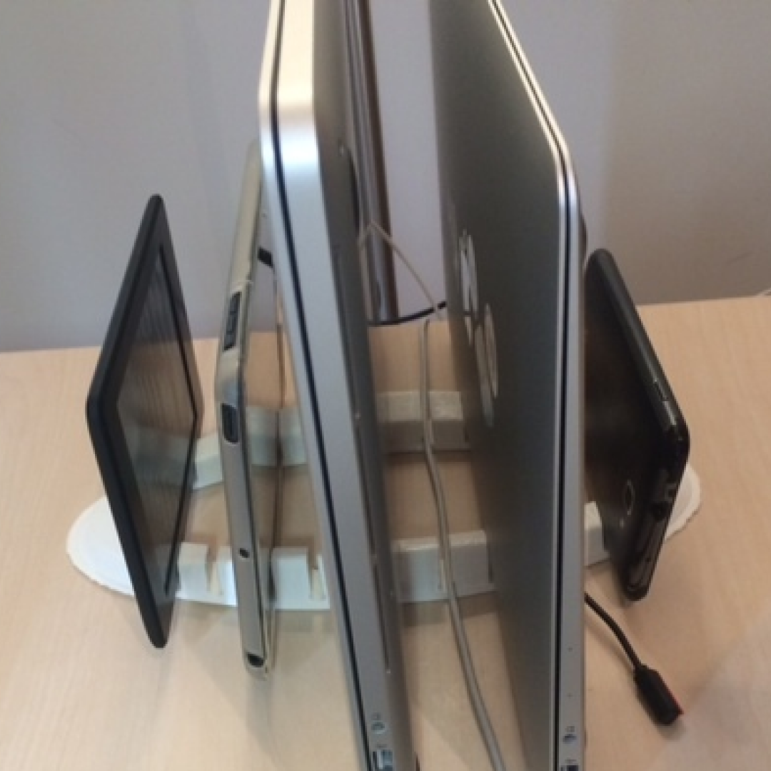 Vertikální stojan pro 5 zařízení Apple. Např. Macbook Pro Retina 15, Macbook Air 13, Kindle Paperwhite, iPad a iPad mini. Má také kabelové drážky, takže nabíjecí kabely nevylétávají ze stolu, když vytáhnete zástrčku.